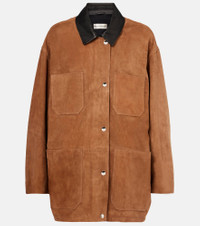 Each piece from Nour Hammour is artisanal, destined to be prized and passed down. A prime example, the Barn jacket is a relaxed style made from brown suede with black leather trims. Product Details - Material: 100% lamb leather (suede) - Care instructions: specialist clean - Made in Turkey - Designer color name: Tobacco Suede & Black - Item color: brown - Lining: 63% cupro, 37% viscose - Closure: snap-buttoned front - Pockets: breast pockets, patch pockets - Item number: P01032932 Size & Fit - True to size - Dropped shoulders - Oversized - Non-stretchy fabric - Falls below the hip - The model seen in the picture is 178cm-5'10" and wearing a size FR 36
