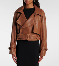 The Hatti biker jacket from Nour Hammour has a cropped silhouette accented with an adjustable belt. The supple leather construction, the exaggerated peak lapels, and tonal cuff straps all bring character to the design. Product Details - Material: 100% lamb leather - Care instructions: specialist clean - Made in Turkey - Designer color name: Vintage Camel - Item color: brown - Lining: 63% cupro, 37% viscose - Lining II: 100% silk - Peak lapel - Belt loops - Detachable belt - Cuff: strap, buckle and loops - Item number: P01102413 Size & Fit - True to size - Loose fit, comes with belt - Non-stretchy fabric - Slightly cropped - The model seen in the picture is 178cm-5'10" and wearing a size FR 36
