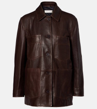 Nour Hammour’s approach to leatherwork brings enduring elegance to luxury outerwear. Crafted from glossy leather, this jacket features a buttoned front, angled chest pockets, and practical patch pockets — combining timeless design with contemporary edge. Product Details - Material: 100% lamb leather - Care instructions: specialist clean - Made in Turkey - Designer color name: Chocolate Fondant - Item color: brown - Lining: 100% rayon - Pockets: angled chest pockets, patch pockets - Closure: buttoned front - Item number: P01060703 Size & Fit - True to size - Designed for a loose fit - Non-stretchy fabric - Falls below the hip - The model seen in the picture is 178cm-5'10" and wearing a size FR 36
