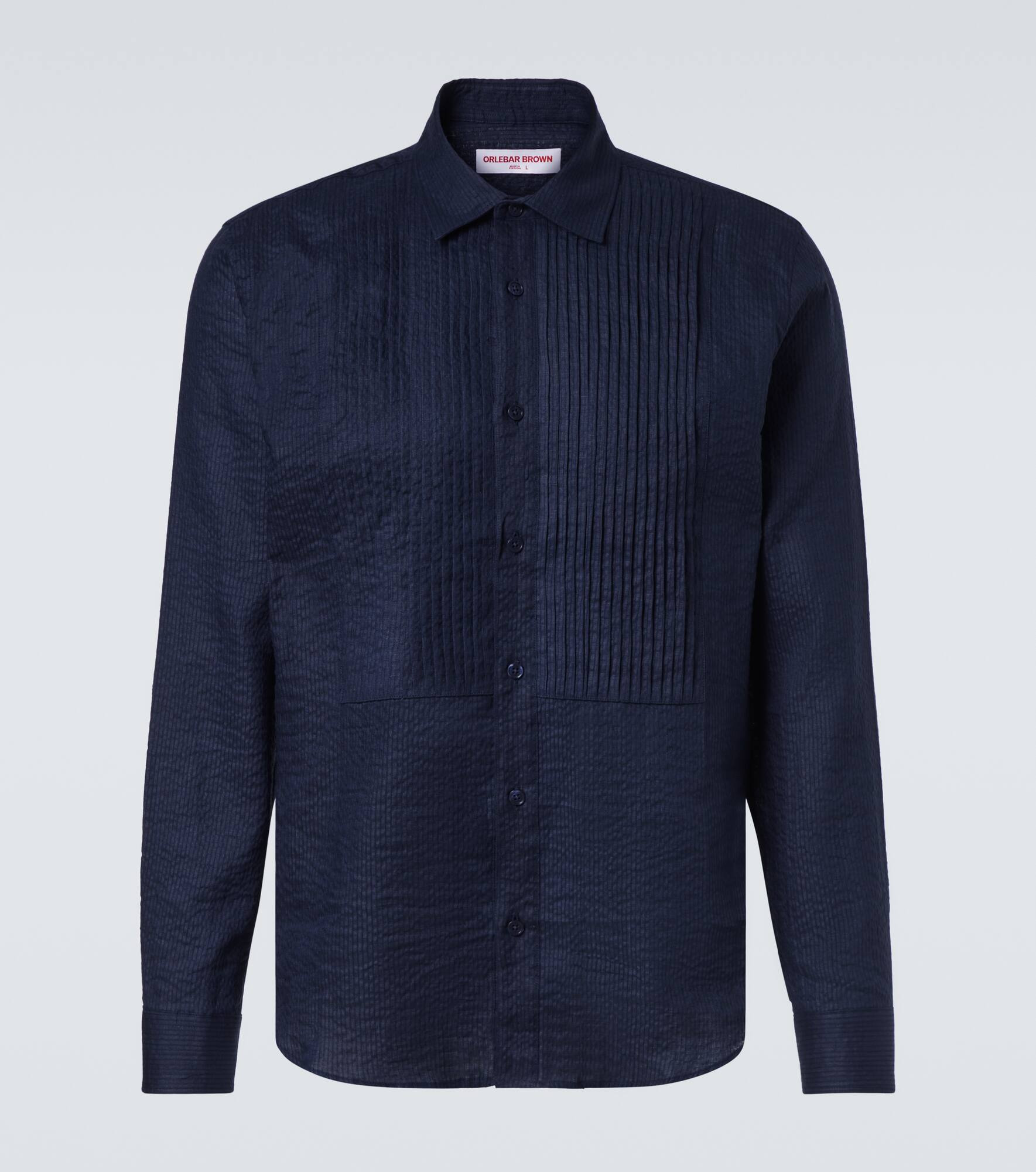 The Giles tuxedo shirt brings breathable construction to the classic formalwear silhouette of the tuxedo shirt. The piece comes with the pleated bib-front detail but is made from a blend of cotton and linen. Product Details - Material: 70% cotton, 30% linen - Care instructions: machine wash at 30 degrees - Made in Portugal - Designer color name: Night Iris - Item color: blue - Dress shirt - Closure: buttoned front - Collar: classic (Straight point) - Cuff: buttoned - Item number: P01059607 Size & Fit - True to size - Without pleats in the back - Regular fit - Non-stretchy fabric - Falls below the hip - Height of model is 189cm-74.5" and wears a size L