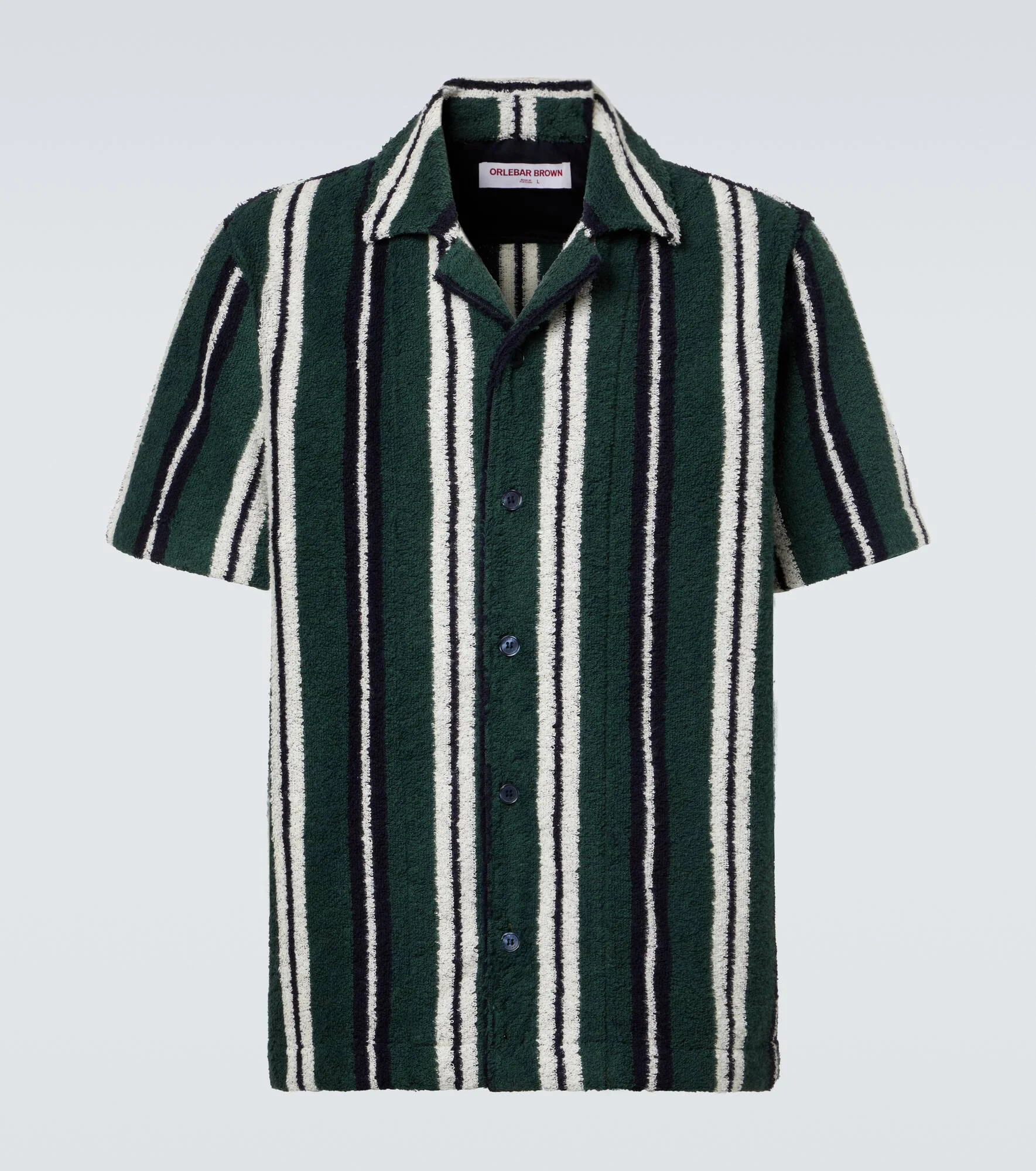The Griffith bowling shirt from Orlebar Brown showcases a striped pattern. This piece is made from soft cotton terry with a toweling effect, making it ideal for transitioning from the beach to the boardwalk. Product Details - Material: 90% cotton, 10% polyester - Care instructions: hand wash - Made in Portugal - Designer color name: Tarragon Stripe - Item color: green, multicolor - Collar: Cuban - Closure: buttoned front - Item number: P01133924 Size & Fit - True to size - Without pleats in the back - Designed for a loose fit - Non-stretchy fabric - Falls below the hip - The model in the picture is 185cm-6'1" and wearing a size L