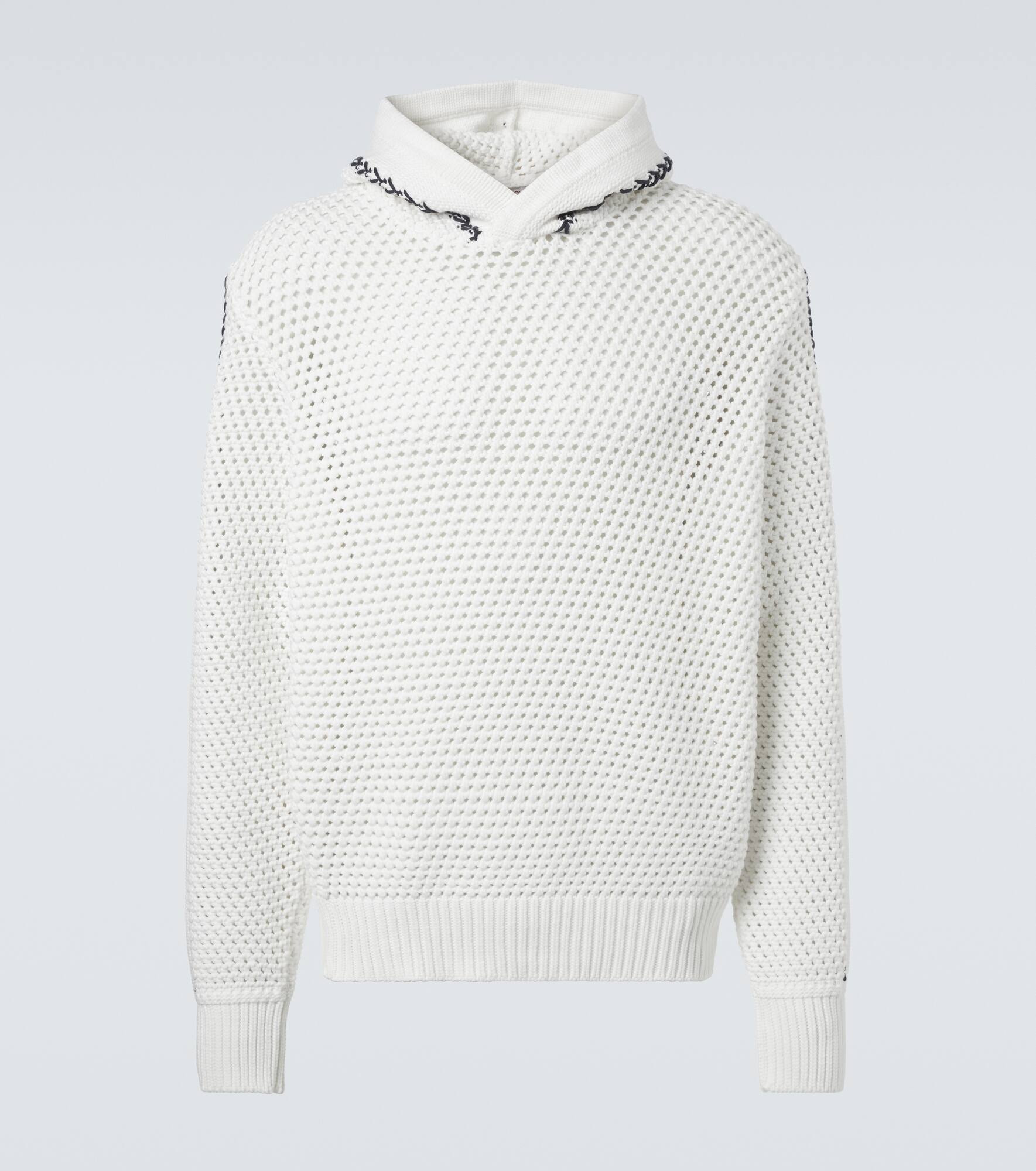 A prime example of textured colorwork, the Kirk crochet hoodie is made from cotton-blend yarn. The design has a ribbed hem, a slouchy hood, and a striped pattern. Product Details - Material: 55% cotton, 45% polyamide - Care instructions: hand wash - Made in Italy - Designer color name: ea Mist /Night Iris - Item color: white - Hood - Hem: ribbed - Item number: P01098250 Size & Fit - True to size - Semi-sheer - Designed for a loose fit - Slightly stretchy fabric - Falls below the hip - Height of model is 188cm-74" and wears a size L