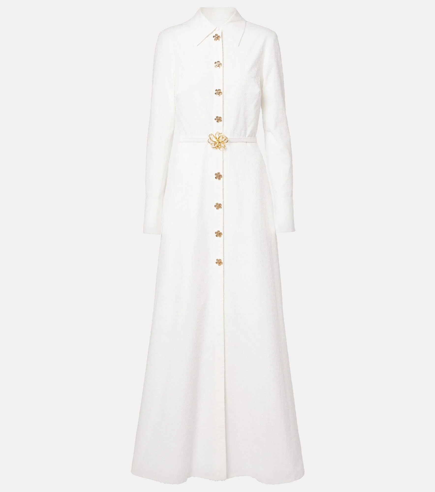 Oscar de la Renta can always be relied on for unequivocally glamorous designs. Made from cotton poplin, this shirt dress features gold-toned buttons, a removable belt, and a chain-link inspired pattern using a series of the letter 'O' to pay homage to the brand's name. Product Details - Material: 100% cotton - Care instructions: dry clean - Made in Italy - Designer color name: Off White - Item color: white - Hardware color: gold - Collar: classic (Straight point) - Closure: buttoned front - Detachable belt - Pockets: side slit pockets - Cuff: buttoned - Side slits - Item number: P01123674 Size & Fit - True to size - Cinched waist - Non-stretchy fabric - Height of model is 178cm-70" and wears a size XS