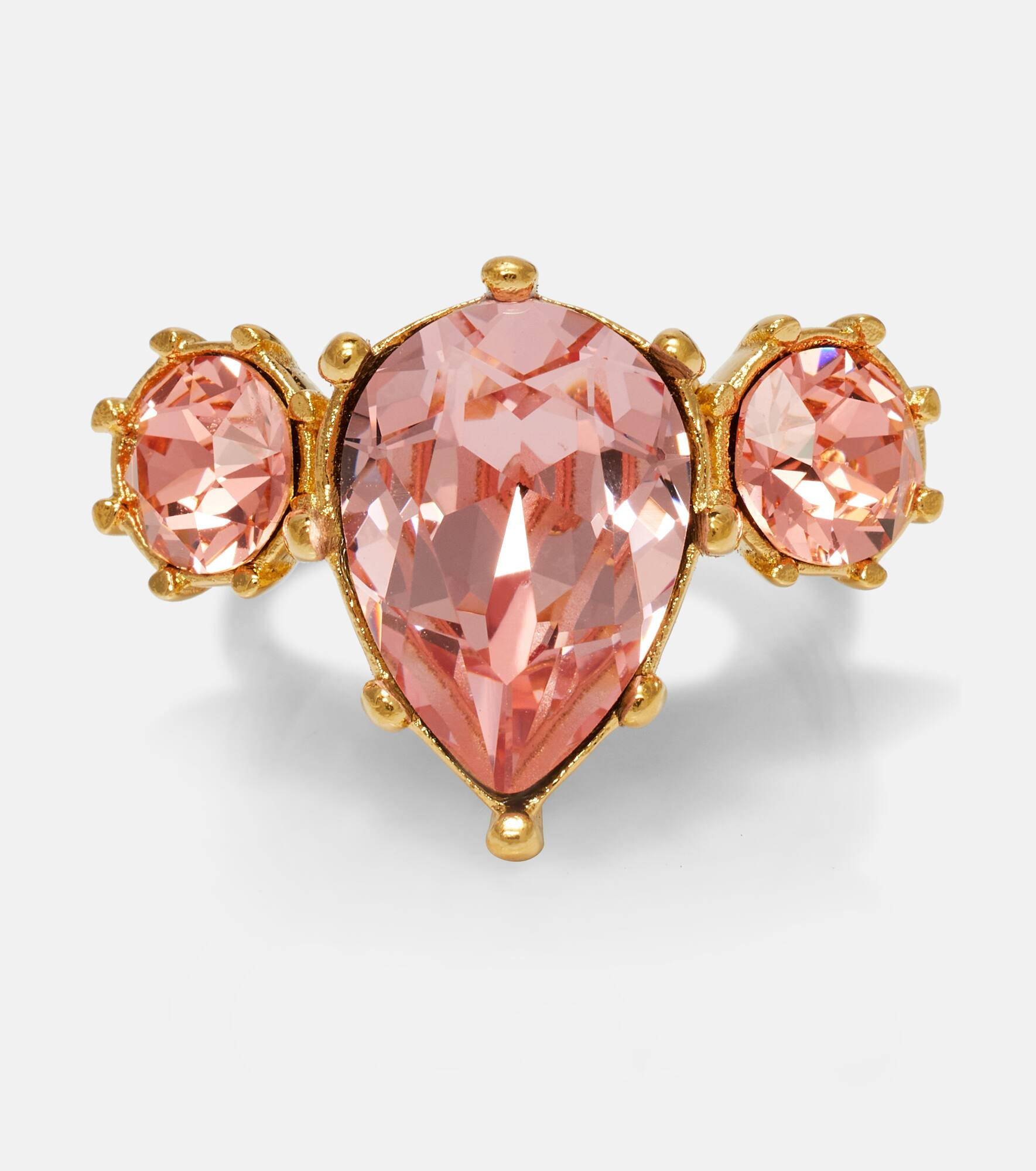 This ring from Oscar de la Renta is made in Italy from gold-toned brass. The piece has a pear-shaped center crystal stone nestled between two smaller stones on each side. Product Details - Material: brass, glass - Made in Italy - Item color: pink, gold - Includes: box, dust bag - Item number: P01121711 Size & Fit - Width 1.5cm-0.5" - Max. width 1cm-0.5" - Circumference 5,2cm-2"