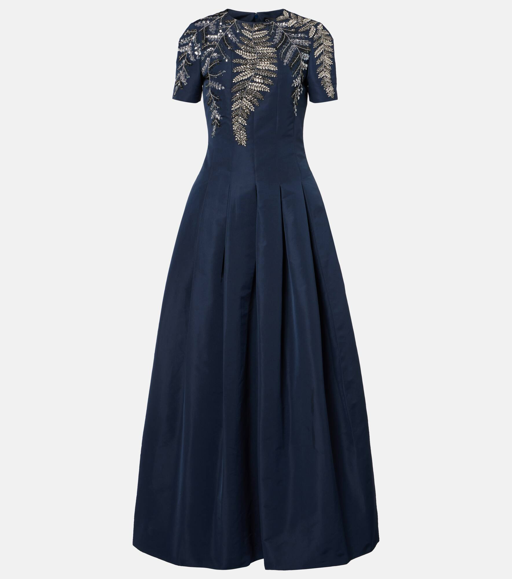 Known for its romantic rendering of blooms, Oscar de la Renta's designs bring the beauty of nature to ready-to-wear. Case in point, this faille gown is characterized by its foliage-inspired pattern near its neckline, embellished with a mixture of eye-catching beads and sequins. Product Details - Material: 100% polyester - Care instructions: spot clean - Made in Italy - Designer color name: Navy - Item color: blue - Lining: 100% silk - Closure: concealed zipped back - Pockets: side slit pockets - Item number: P01080899 Size & Fit - Fits large to size - we recommend trying one size smaller - Cinched waist - Non-stretchy fabric - The model seen in the picture is 178cm-5'10" and wearing a size US 2