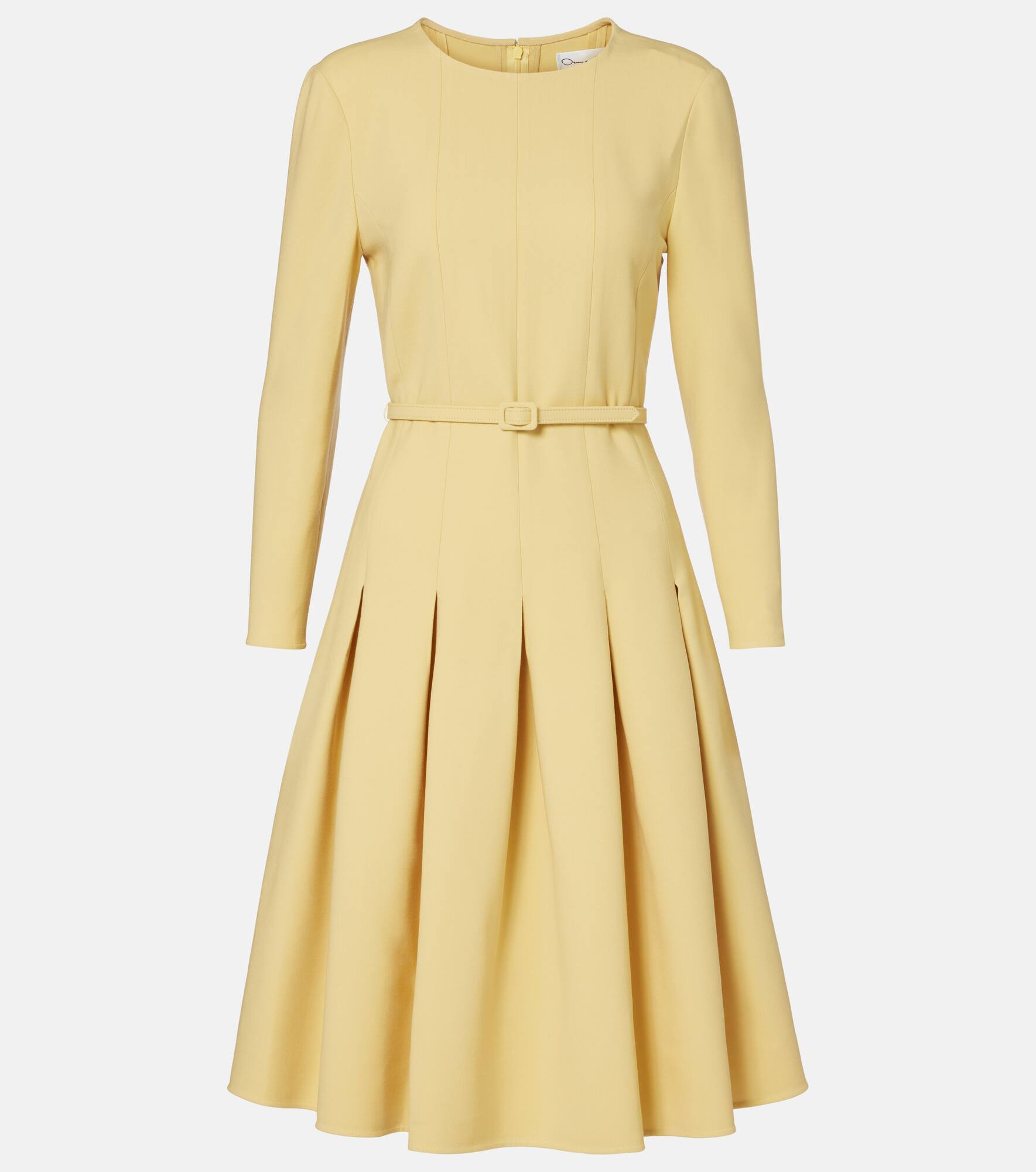 Oscar de la Renta can always be relied on for unequivocally glamorous designs. This midi dress is crafted from crepe, has bold pleats, and is finished with a charming belt. Product Details - Material: 94% wool, 5% elastane, 1% other fibres - Care instructions: dry clean - Made in Italy - Designer color name: Chamomile - Item color: yellow - Closure: invisible zipper - Detachable belt - Item number: P01080896 Size & Fit - True to size - Cinched waist - Non-stretchy fabric - The model seen in the picture is 178cm-5'10" and wearing a size US 4