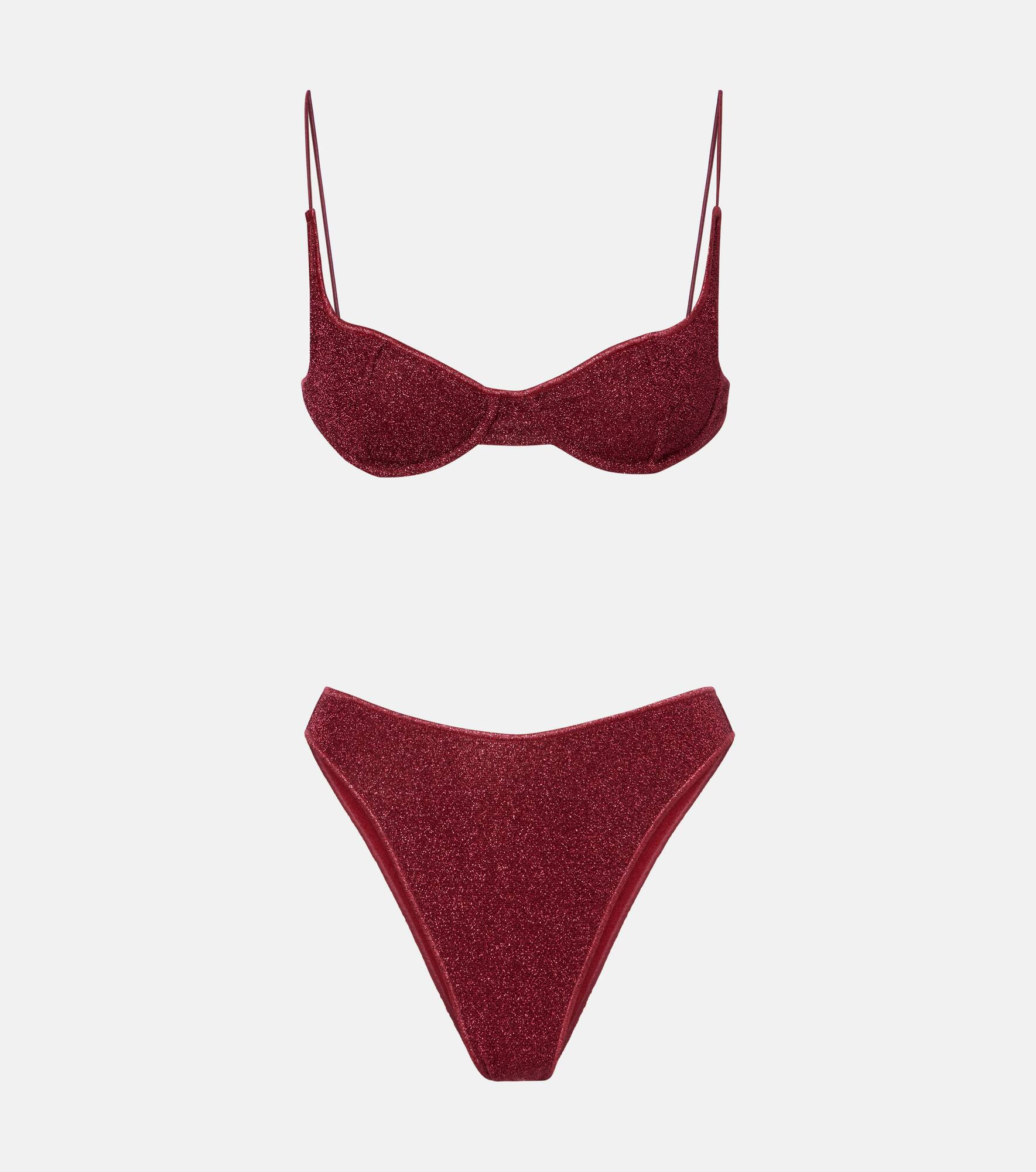This chic bikini features high-rise bottoms and a self-tie top with underwired cups for support. This piece is made with Oseree’s Lumiere fabric, which is threaded with very fine metallic strands to achieve a unique shimmering finish. Product Details - Material: 64% polyamide, 36% metallic fibres - Care instructions: machine wash at 30 degrees - Made in Italy - Designer color name: Burgundy - Item color: burgundy - Lining: 80% polyamide, 20% elastane - Two-piece set - Self-tie back - Underwired cups - Elasticated waistband - Item number: P01078621 Size & Fit - True to size - Underwired top - Unpadded Top - Medium-cut leg - If you wear a C cup or bigger, we recommend trying one size larger - The model seen in the picture is 178cm-5'10", cup size B, and wearing a size XS