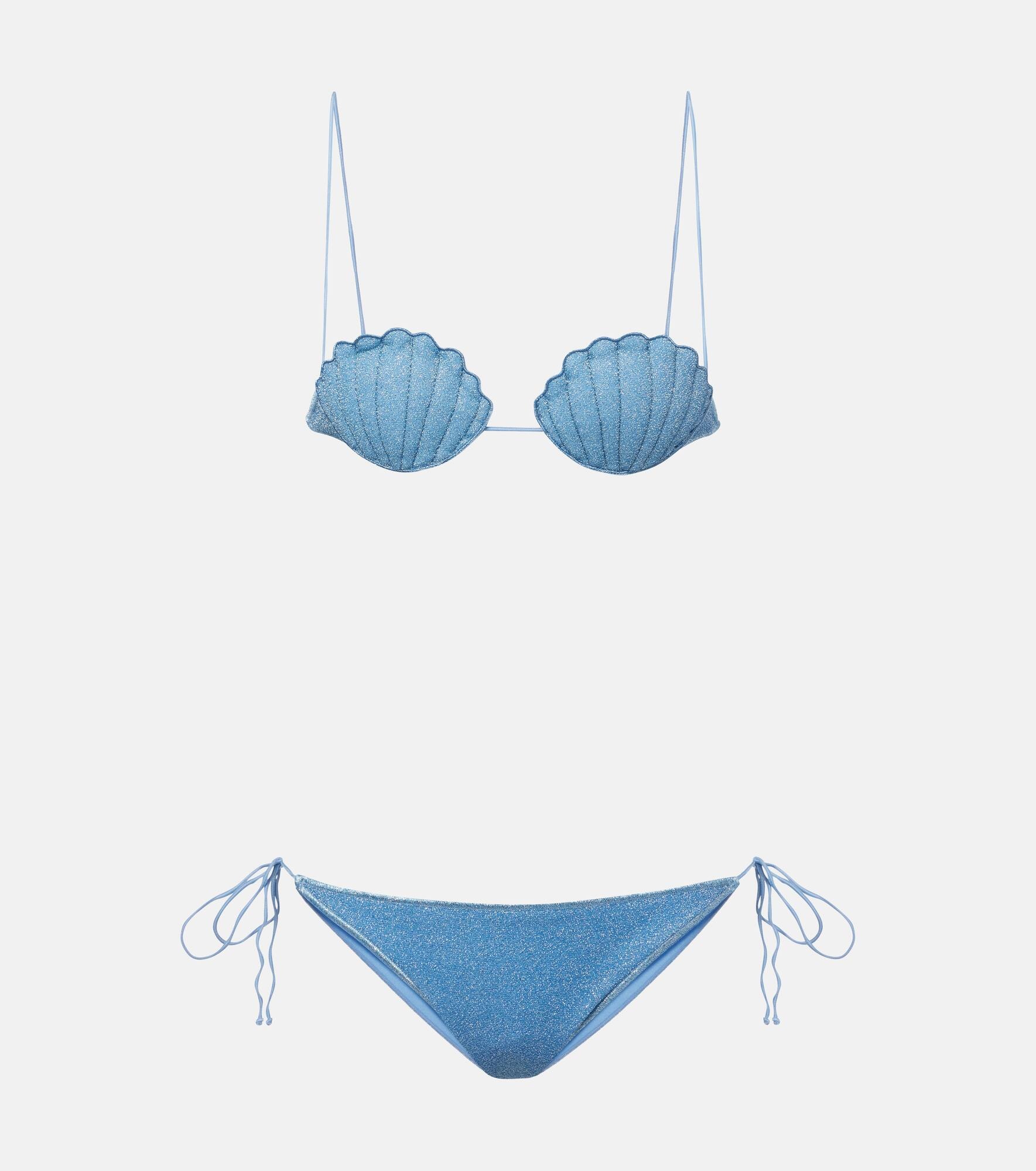 Crafted in Italy, the Lumiere bikini from Oseree showcases shell-shaped cups. This design features thin straps and is finished with a subtle glitter effect. Product Details - Material: 64% polyamide, 36% metallic fibres - Care instructions: machine wash at 30 degrees - Made in Italy - Designer color name: Crystal - Item color: blue - Two-piece set - Lining: 80% polyamide, 20% elastane - Closure: self-ties - Item number: P01078642 Size & Fit - Fits small to size - we recommend trying one size larger - Cup size: A - Please note: small cups - Padded top - Minimal coverage - Medium-cut leg - The model in the picture is 185cm-6'1" and wearing a size M