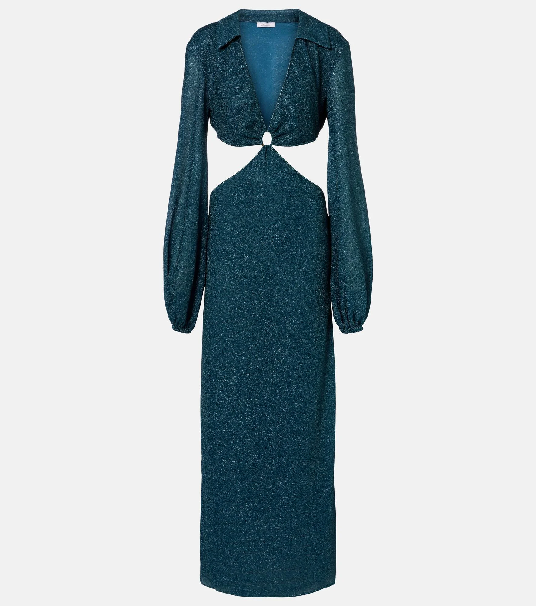 This maxi dress is made with Oseree’s Lumiere fabric, which is threaded with very fine metallic strands to achieve a unique shimmering finish. The style boasts cutouts at the waist and a central ring detail. Product Details - Material: 64% polyamide, 36% metallic fibres - Care instructions: hand wash - Made in Italy - Color: green - Designer color name: Peacock - Item color: green - Cuff: elasticated - Elasticated waistband - Collar: classic (Straight point) - Long vent - Lining: 80% polyamide, 20% elastane - Item number: P01139500 Size & Fit - True to size - Cinched waist - Slightly stretchy fabric - The model seen in the picture is 178cm-5'10" and wearing a size XS