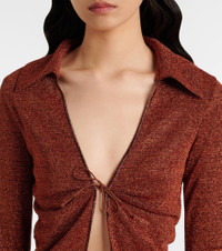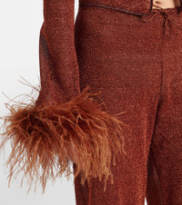 Oseree’s Lumiere Plumage collection lends extra opulence to the brand's signature shimmering fabric with ostrich feather trims. This blouse is a slim, fitted style. Product Details - Material: 64% polyamide, 36% metallic fibres - Care instructions: hand wash - Made in Italy - Designer color name: Brown - Item color: brown - Closure: self-ties - Item number: P01042150 Size & Fit - True to size - Straight fit - Non-stretchy fabric - Falls to the hip - The model seen in the picture is 178cm-5'10" and wearing a size S