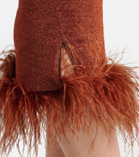 Oseree’s Lumiere Plumage collection lends extra opulence to the brand's signature shimmering fabric with ostrich feather trims. This minidress is a fitted style that hangs from thin straps. Product Details - Material: 64% polyamide, 36% metallic fibres - Care instructions: hand wash - Made in Italy - Designer color name: Brown - Item color: brown - Lining: 82% polyamide, 18% elastane - Item number: P01042148 Size & Fit - True to size - Petite sizing - Low back - Fitted - slit length 15,0cm-6" - The model seen in the picture is 178cm-5'10" and wearing a size S - Length of fringe 20,0cm-8"
