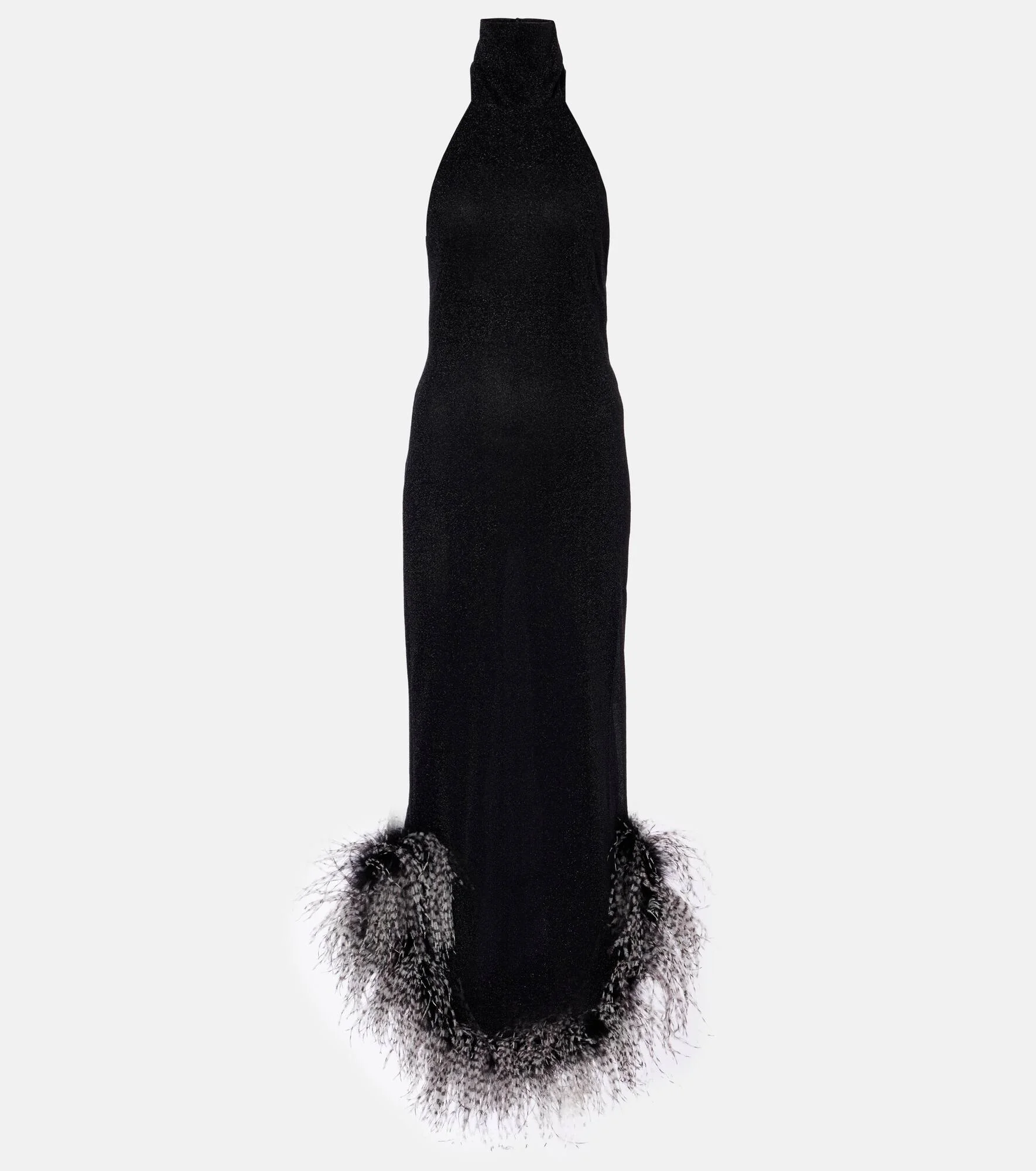 This maxi dress is part of Oseree’s Lumiere Plumage collection, which lends extra opulence to the brand's signature shimmering fabric with ostrich feather trims. The design is finished with a halterneck. Product Details - Material: 64% polyamide, 36% metallic fibres - Care instructions: hand wash - Made in Italy - Color: black - Designer color name: Black - Item color: black, white - Contains non-textile parts of animal origin - Trim: 100% feathers - Lining: 82% polyamide, 18% elastane - Closure: buttoned back - Hem: rounded - Item number: P01139501 Size & Fit - True to size - Low back - Fitted - Slightly stretchy fabric - The model seen in the picture is 178cm-5'10" and wearing a size S
