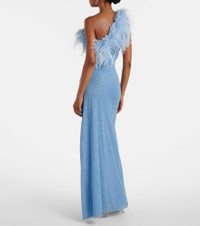 Featuring a one-shoulder neckline trimmed with exquisite feathers, this maxi dress is destined for dazzling special occasions and more. This piece is made with Oseree’s Lumiere fabric, which is threaded with very fine metallic strands to achieve a unique shimmering finish. Product Details - Material: 64% polyamide, 36% metallic fibres - Care instructions: hand wash - Made in Italy - Designer color name: Crystal - Item color: blue - Trim: 100% feathers - Lining: 82% polyamide, 18% elastane - Item number: P01078631 Size & Fit - Fits small to size - we recommend trying one size larger - Fitted - Stretchy fabric - slit length 82,0cm-32.5" - The model seen in the picture is 178cm-5'10" and wearing a size S
