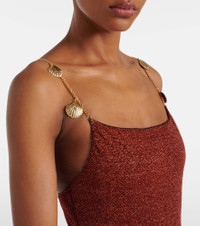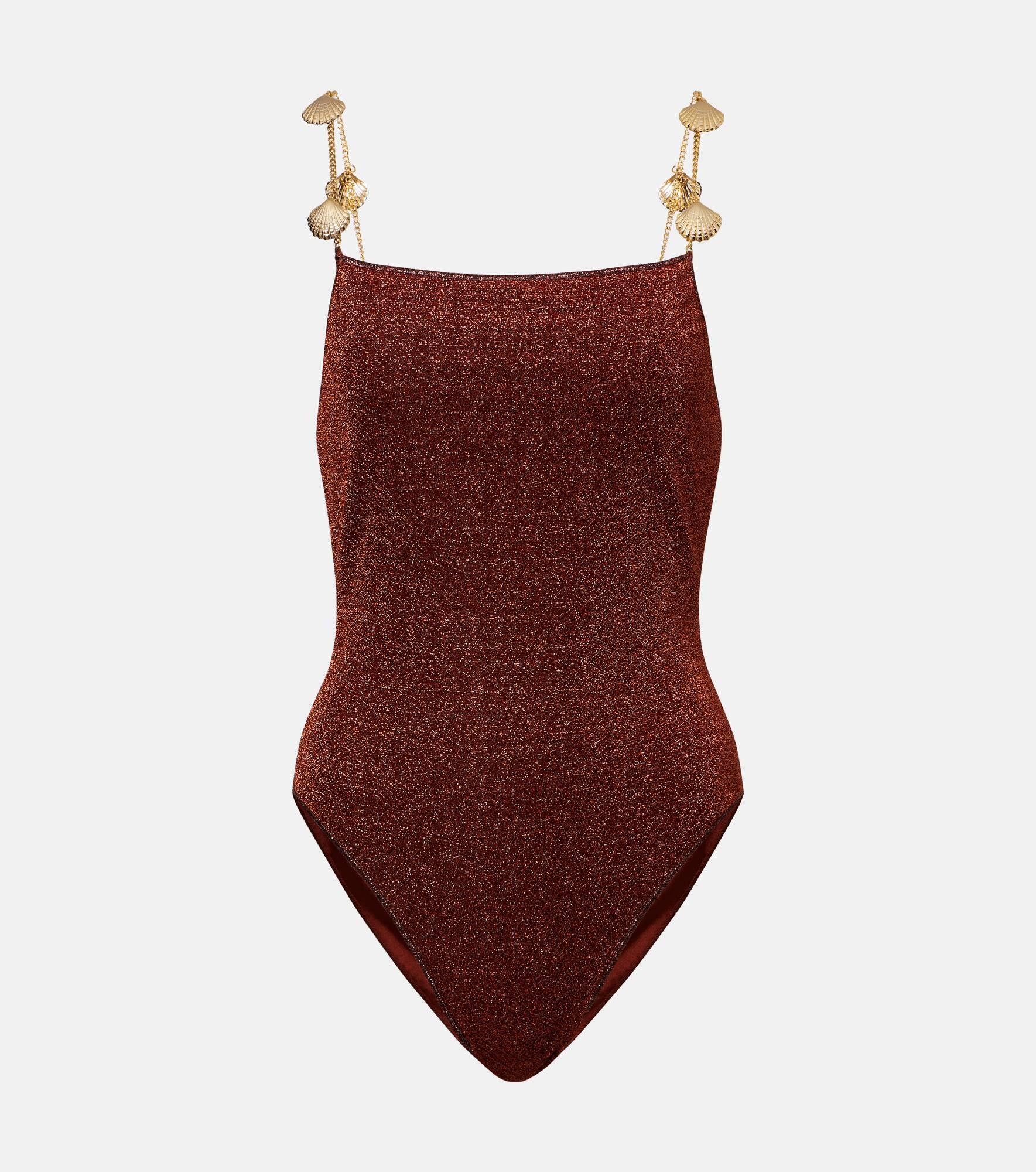 This swimsuit is made with Oseree’s Lumiere fabric, which is threaded with very fine metallic strands to achieve a unique shimmering finish. It hangs from straps embellished with seashells. Product Details - Material: 64% polyamide, 36% metallic fibres - Care instructions: machine wash at 30 degrees - Made in Italy - Designer color name: Brown - Item color: brown - Lining: 80% polyamide, 20% elastane - Item number: P01042154 Size & Fit - Fits small to size - we recommend trying one size larger - Unpadded Top - High-cut leg - The model seen in the picture is 178cm-5'10", cup size B, and wearing a size S