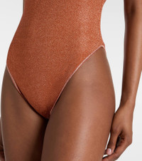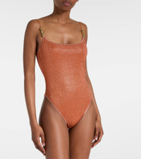 Crafted in Italy, the Lumiere swimsuit from Oseree features thin straps with gold-tone hardware. This design is finished with a subtle glitter effect. Product Details - Material: 64% polyamide, 36% metallic fibres - Care instructions: hand wash - Made in Italy - Designer color name: Orange - Item color: orange - Lining: 80% polyamide, 20% elastane - Hardware color: gold - Item number: P01078644 Size & Fit - True to size - Petite sizing - Unpadded Top - Minimal coverage - High-cut leg - The model in the picture is 185cm-6'1" and wearing a size S