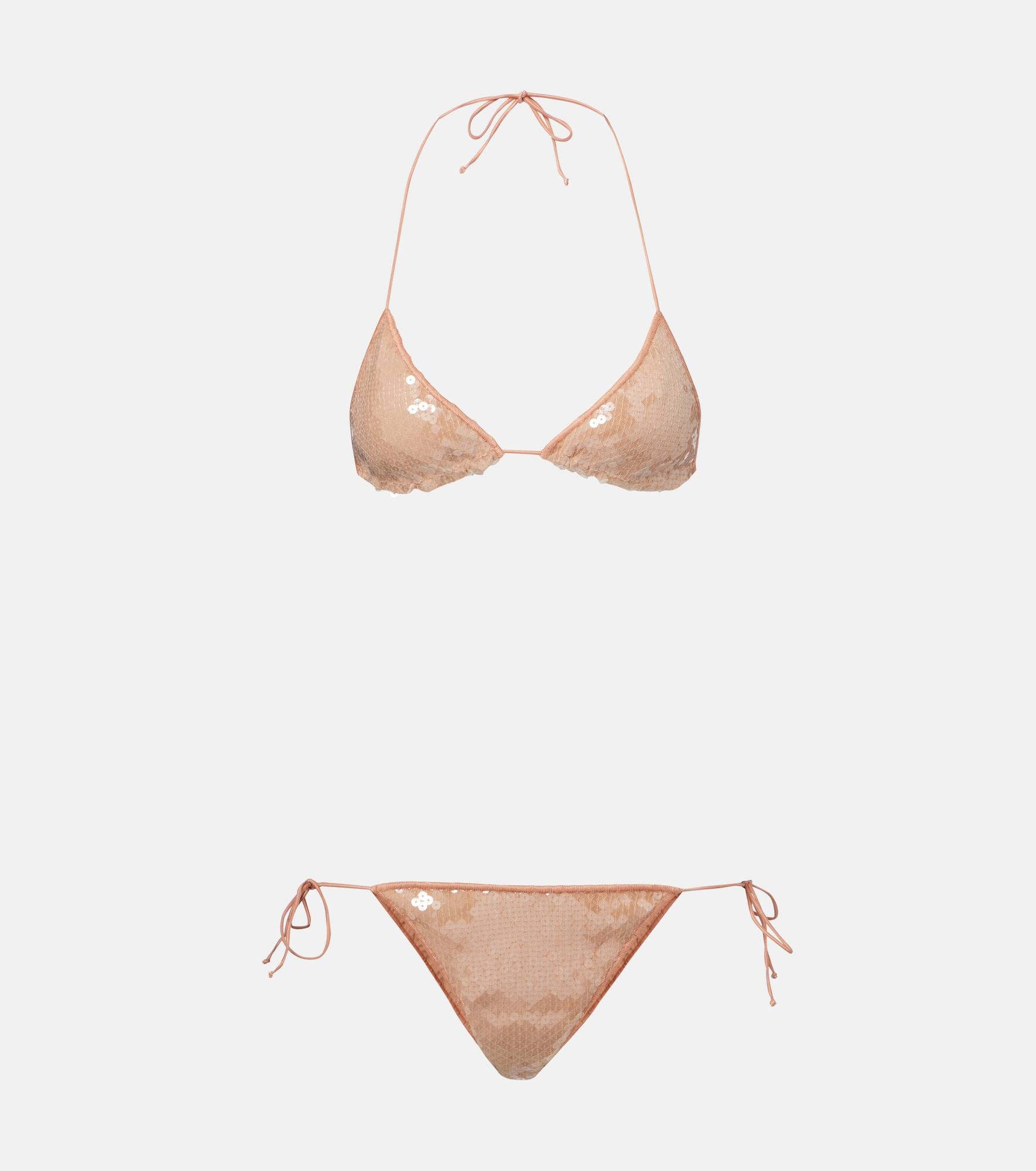 Explore your glamorous side with Oseree's swimwear, like this bikini. Destined to make a statement at the beach or pool, the design is embellished with shimmering sequins and offers minimal coverage. Product Details - Material: 100% polyester - Care instructions: hand wash - Made in Italy - Designer color name: Beige - Item color: beige - Lining: 80% polyamide, 20% elastane - Item number: P01042155 Size & Fit - True to size - Please note: small cups - Minimal coverage - High-cut leg - The model seen in the picture is 178cm-5'10", cup size B, and wearing a size S