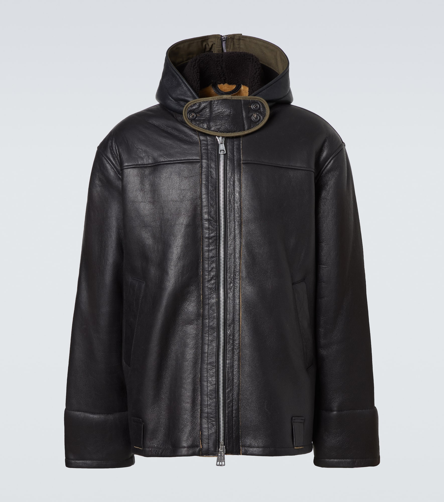 Our Legacy has achieved cult status for its Scandinavian-cool take on timeless silhouettes and custom-developed fabrics. Showcasing a relaxed fit, the Blizzard jacket is cut from leather and fitted with a zipped hood and plush lining. Product Details - Material: 100% lamb leather - Care instructions: specialist clean - Made in Portugal - Designer color name: Natural Aviator Shearling - Item color: brown, beige - Material II: 100% sheep leather - Material III: 100% cotton - Details: 100% horn - Contains non-textile parts of animal origin - Closure: two-way zipped front with snap-button fastenings - Hood - Pockets: snap-buttoned pockets - Belt loops - Item number: P01084885 Size & Fit - True to size - Dropped shoulders - Designed for a loose fit - Non-stretchy fabric - Falls below the hip - The model in the picture is 185cm-6'1" and wearing a size IT 50