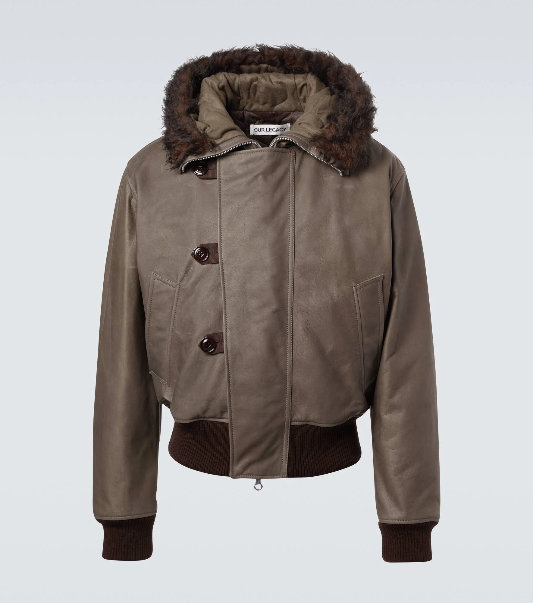 Our Legacy has achieved cult status for its Scandinavian-cool take on timeless silhouettes and custom-developed fabrics. This jacket is cut from leather to a boxy cropped fit, and fitted with a shearling-trimmed hood for added warmth. Product Details - Material: 100% leather - Care instructions: specialist clean - Made in Turkey - Designer color name: Olive Waxy Cattle Hide - Item color: green - Trim: 48% acrylic, 48% wool, 4% elastane - Lining: 100% polyester - Closure: two-way concealed zipped front, toggle fastenings, snap-buttoned front - Pockets: welt pockets - Cuff: ribbed - Hem: ribbed - Hood - Item number: P01085101 Size & Fit - True to size - Dropped shoulders - Designed for a loose fit - Elasticated hem - Non-stretchy fabric - Slightly cropped - Height of model is 190cm-75" and wears a size IT 50