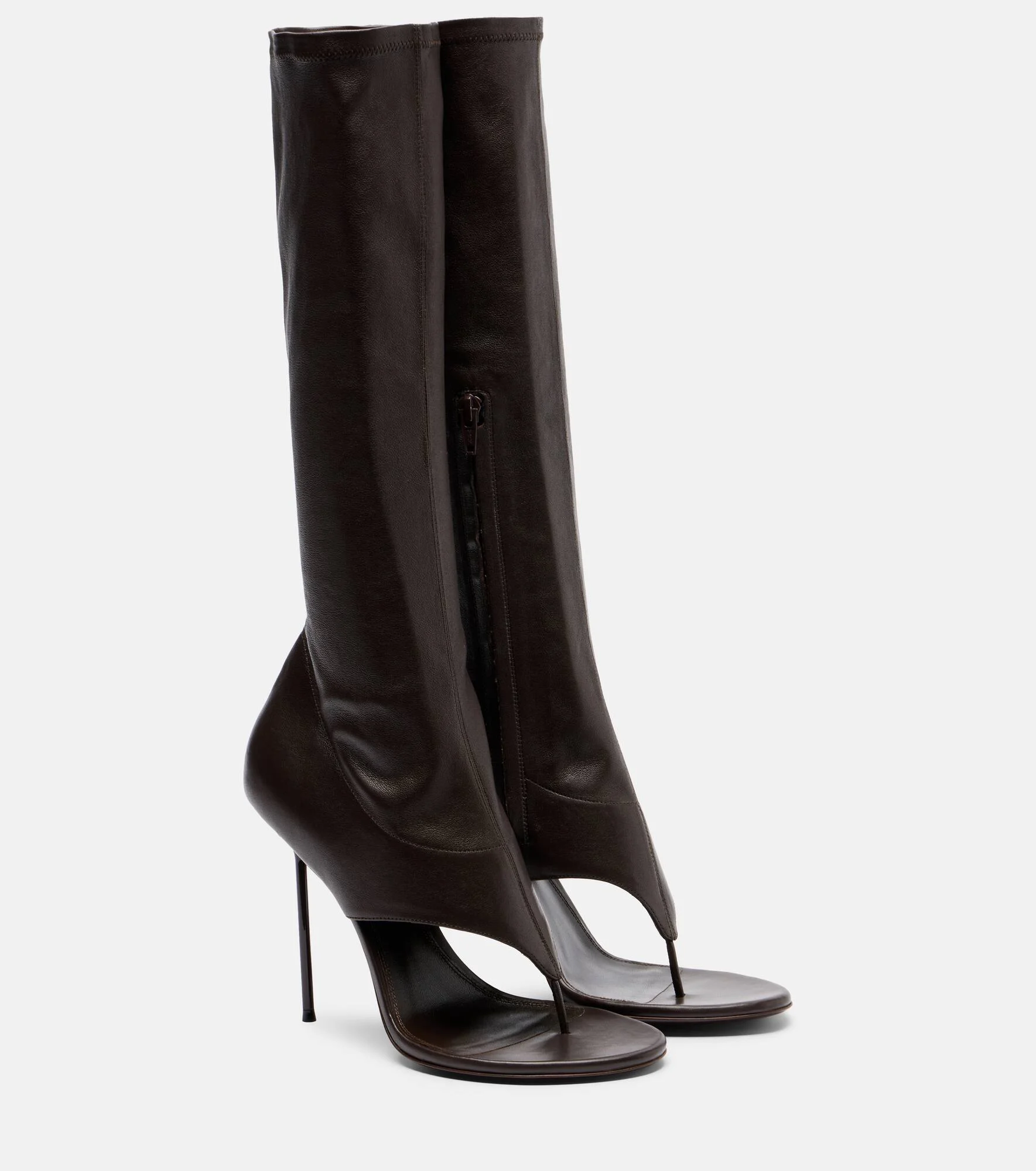 Step in statement-making style with the Lidia knee-high boots from Paris Texas. The pair is crafted in Italy from brown leather and features rounded open-toe silhouettes with 105mm stiletto heels. Product Details - Upper: leather (nappa) - Lining: leather - Sole: leather insole and sole - Color: brown - Toe shape: almond open toe - Made in Italy - Includes: shoe box, dust bag - Designer color name: Ebano - Closure: zipped side - Item number: P01143909 Size & Fit - True to size - European sizes - 10,5cm-4" heel - 35cm-14" shaft height (size EU 38) - 27cm-10.5" shaft width (size EU 38) - shaft width measured on largest part of boot