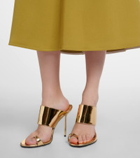 Step in statement-making style with the Lidia mules from Paris Texas. The pair is crafted in Italy from patent leather and features rounded open-toe silhouettes with 105mm stiletto heels. Product Details - Upper: calf leather - Lining: leather - Sole: leather insole and sole - Color: gold - Toe shape: almond open toe - Made in Italy - Includes: shoe box, dust bag - Designer color name: Gold - Closure: ankle strap - Item number: P01143864 Size & Fit - Fits slightly small to size - we recommend trying a half size larger - European sizes - 10,5cm-4" heel
