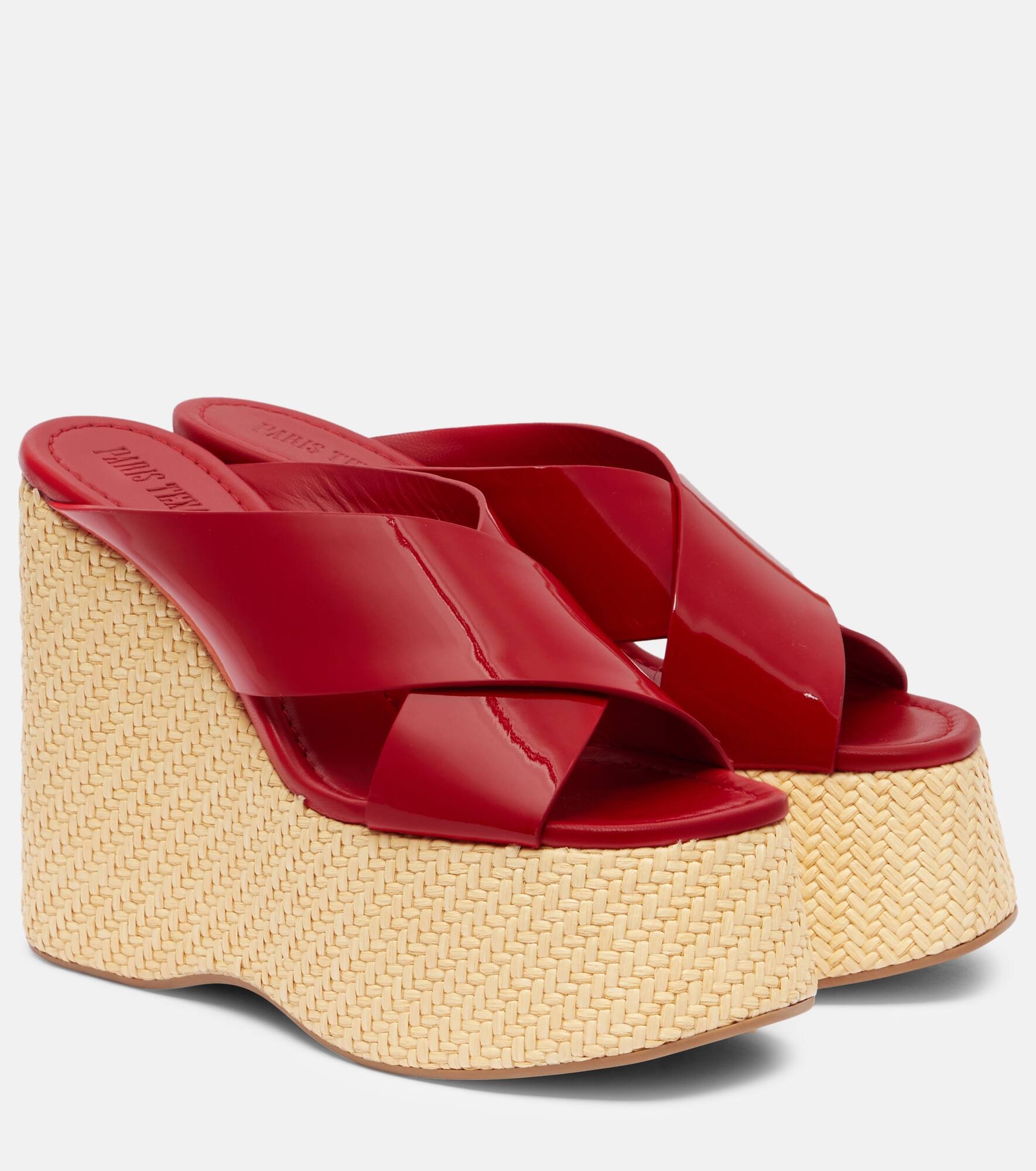 The Mara wedge mules from Paris Texas are sure to make every step you take a chic one. The pair is set atop sculpted woven bases and features sleek cross-over patent leather uppers with square open toes. Product Details - Upper: leather - Lining: leather - Sole: leather insole, rubber sole - Toe shape: square open toe - Made in Italy - Includes: shoe box, dust bag - Designer color name: Fiery Red-Naturale - Item color: red - Contains non-textile parts of animal origin - Item number: P01043502 Size & Fit - True to size - For narrow feet, we recommend trying a half size smaller - European sizes - 6,5cm-2.5" platform (size EU 38) - 14cm-5.5" wedge heel (size EU 38)