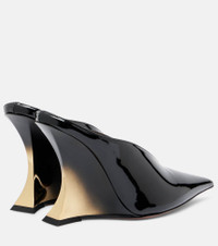 Step in statement-making style with the Nina mules from Paris Texas. The pair is crafted in Italy from patent leather and boasts sleek pointed toes and sculptural 105mm gradient wedge heels. Product Details - Upper: calf leather - Lining: leather - Sole: leather insole and sole - Color: black - Toe shape: pointed toe - Made in Italy - Includes: dust bag, shoe box - Designer color name: Black-Gold/Black - Item color: black - Item number: P01143884 Size & Fit - True to size - European sizes - 10,5cm-4" wedge heel