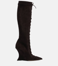 Look to Paris Texas for shoes that embody modern sophistication with a glamorous flair. Expertly crafted from soft suede, the Nina lace-up knee-high boots feature sharp, pointed toes and inwardly curved 105mm heels. Product Details - Upper: calf leather (suede) - Lining: leather - Sole: leather insole and sole - Toe shape: pointed toe - Made in Italy - Includes: shoe box - Designer color name: Ebano - Item color: brown - Closure: zipped side - Item number: P01099362 Size & Fit - Fits slightly small to size - we recommend trying a half size larger - European sizes - 10,5cm-4" heel (size EU 38) - 40cm-15.5" shaft height (size EU 38) - 34cm-13.5" shaft width (size EU 38) - shaft width measured on largest part of boot