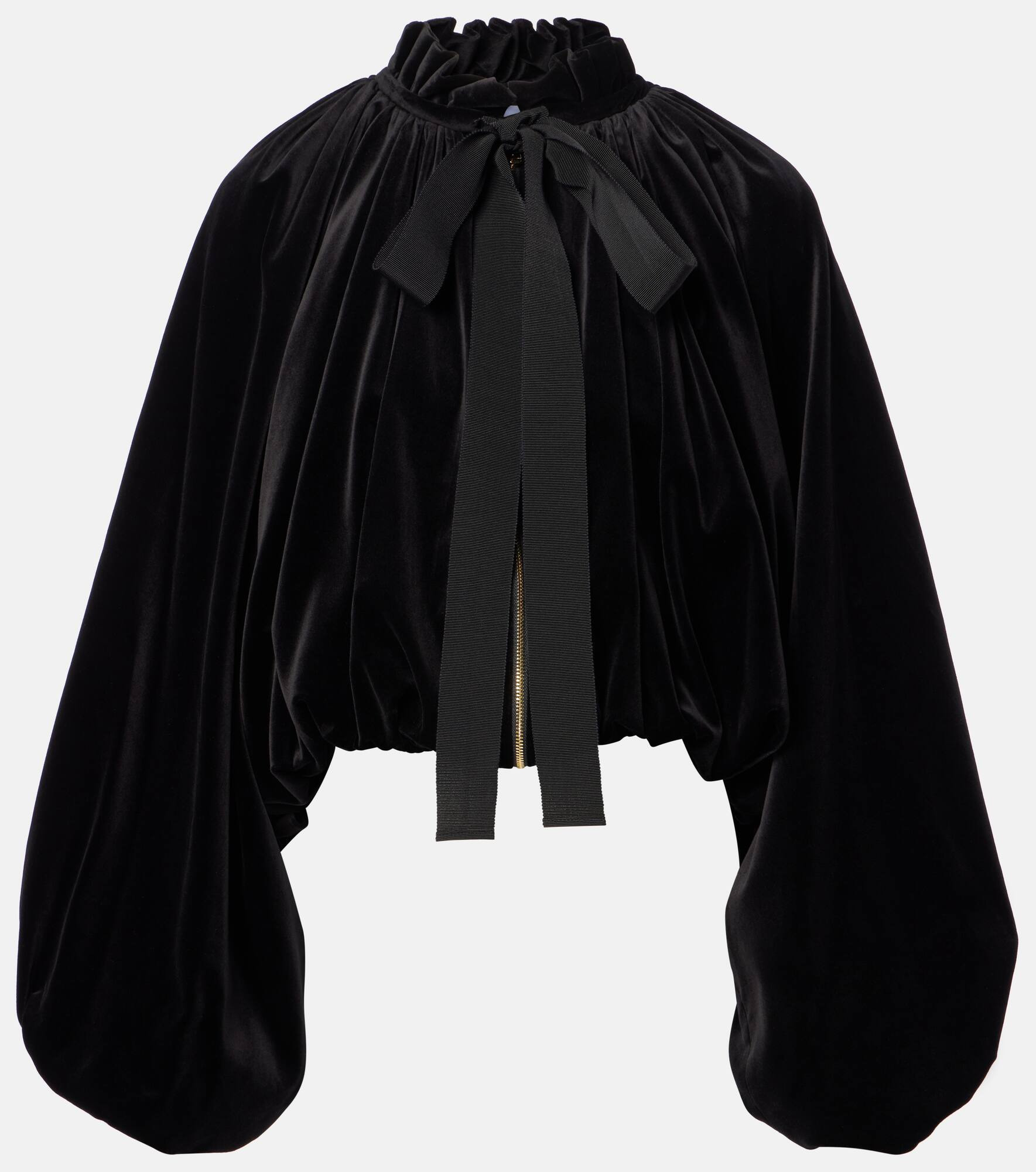 Patou continues to define Parisian style with joyful and refined designs. Crafted from cotton velvet, this jacket showcases a voluminous puffed silhouette, a bow detail at the ruched collar, and a gold-toned zip front. Product Details - Material: 70% cotton, 28% viscose, 2% elastane - Care instructions: dry clean - Made in Poland - Designer color name: Black - Item color: black - Trim: 55% cotton, 45% viscose - Lining: 100% viscose - Hardware color: gold - Closure: zipped front - Self-tie collar - Pockets: side slit pockets - Cuff: elasticated - Hem: elasticated - Fully lined - Item number: P01066299 Size & Fit - True to size - Designed for a loose fit - Elasticated hem - Non-stretchy fabric - Slightly cropped - The model seen in the picture is 178cm-5'10" and wearing a size FR 36