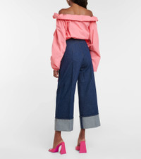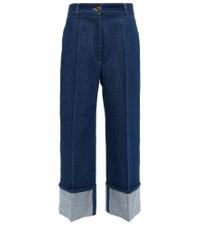 Patou's iconic wide-leg jeans get a refresh with this design, featuring a bold folded cuff. The style features engraved gold-tone buttons, contrasting stitching, and signature darts at the back. Product Details - Care instructions: machine wash at 30 degrees - Made in Bulgaria - Closure: zipper fly, button fastening - Pockets: slit pockets - Material: 100% cotton - Item number: P00707552 Size & Fit - Fits large to size - we recommend trying one size smaller - Non-stretchy fabric - Wide-leg - High-rise - The model seen in the picture is 178cm-5'10" and wearing a size FR 34