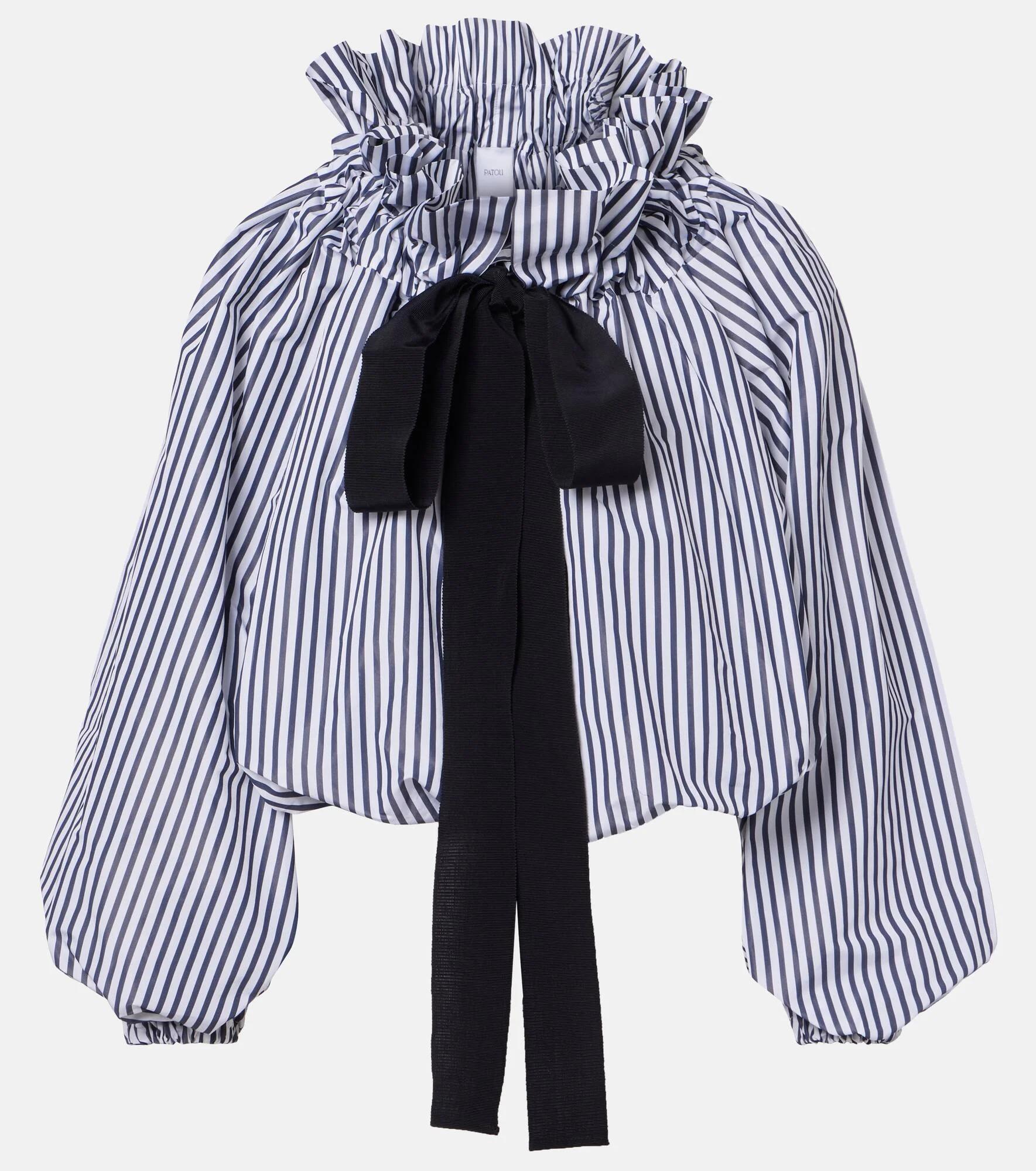 Patou continues to define Parisian style with joyful and refined designs. Featuring a classic striped pattern, this blouse features self-tie detailing and sophisticated gathering at the neckline. Product Details - Material: 100% polyester - Care instructions: dry clean - Made in Poland - Color: blue - Designer color name: Offshore Stripes - Trim: 55% cotton, 45% viscose - Item number: P01142998 Size & Fit - True to size - Elasticated hem - Oversized - Non-stretchy fabric - Slightly cropped - The model seen in the picture is 178cm-5'10" and wearing a size FR 36