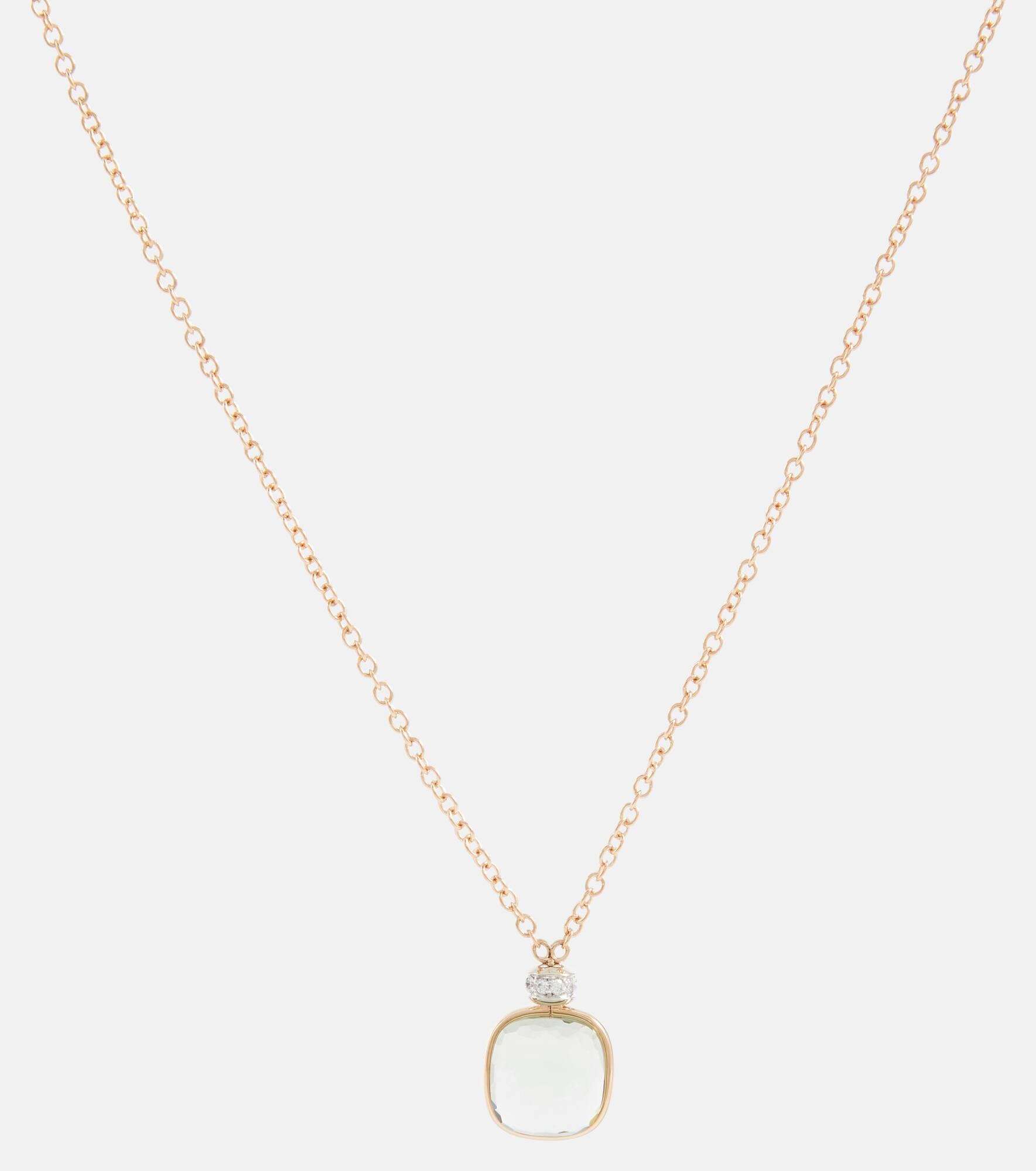 Pomellato’s Nudo necklace is an ethereal construction defined by its use of prasiolite. The gemstone is bonded by a gold band in the brand’s unique Clessidra cut. Made from 18kt Rhodium-plated rose gold and white gold, this piece is finished with a delicate chain and dazzling 0.1ctw white diamonds set into the roundel. Product Details - Material: 18kt rose gold, 18kt white gold - Made in Italy - Stone I: prasiolite - Stone II: diamonds - Closure: lobster-clasp fastening - Item number: P00836650 Size & Fit - Adjustable length - Width 2mm-0.1" - Pendant length 15mm-0.6" - Pendant width 12mm-0.45" - Min. length 37,5cm-15" - Max. length 42cm-16.5"