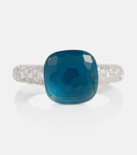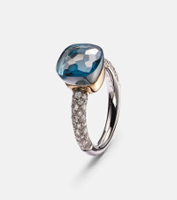 Elegant and colorful, Pomellato's contemporary heirlooms will bring a playful touch to your outfits. The iconic Nudo ring is updated with a slim 18kt white gold band covered in diamonds and features a London blue topaz held in place with an 18kt rose gold bezel setting. Product Details - Material: 18kt white gold, 18kt rose gold - Stone I: topaz, bezel setting - Stone II: white diamonds, pavé setting - Made in Italy - Designer color name: 0 - Item number: P00761704 Size & Fit - Max. width 10mm-0.4"