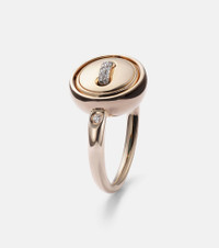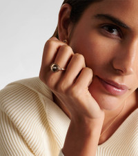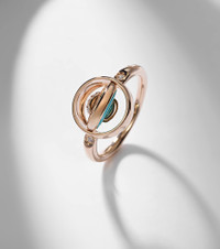 The Pom Pom Dot collection from Pomellato is renowned for its reversible designs, transforming their iconic button motif into a symbol of connection and protection. Made in Italy from 18k rose gold, the Pom Pom ring is adorned with twelve pave-set brilliant diamonds on one side and a vibrant turquoise stone on the other, capturing the duality of strength and serenity in a single, sculptural form. Product Details - Material: 18kt rose gold - Made in Italy - Item color: rose gold - Stone I: diamonds, 0.1ctw, round-cut, pave setting - Stone II: turquoise, 0.9ct, cabochon-cut, bezel setting - This piece features natural diamonds only - Item number: P01050124 Size & Fit - Max. width 13mm-0.5"