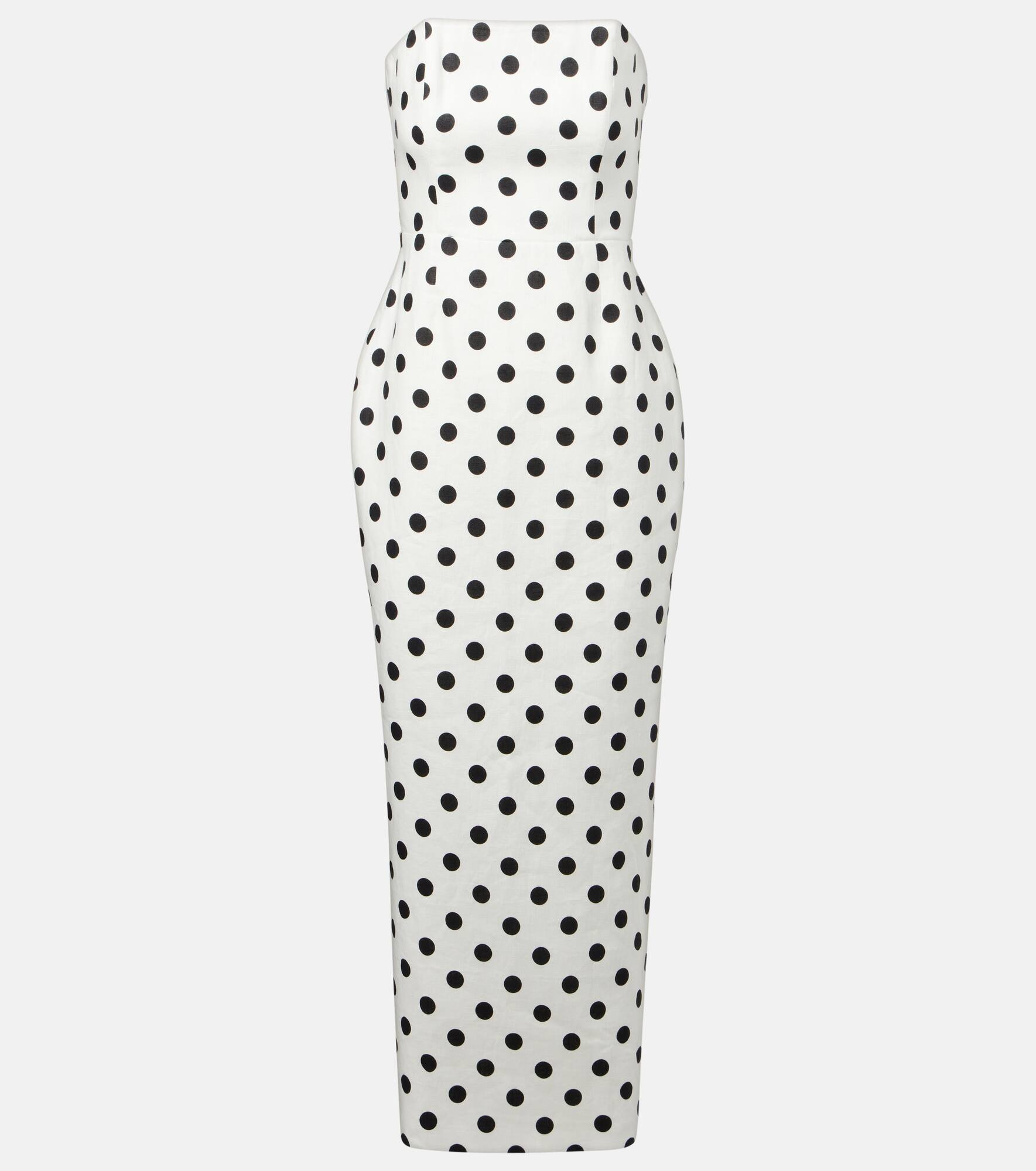 Product Details - Material: 100% linen - Care instructions: dry clean - Made in China - Designer color name: White Black Polka Dot - Item color: white, black - Lining: 100% cotton - Item number: P01067649 Size & Fit - True to size - Low back - Strapless - Internal boned corset for support - Fitted - Non-stretchy fabric - slit length 58,0cm-23" - The model seen in the picture is 178cm-5'10" and wearing a size XS