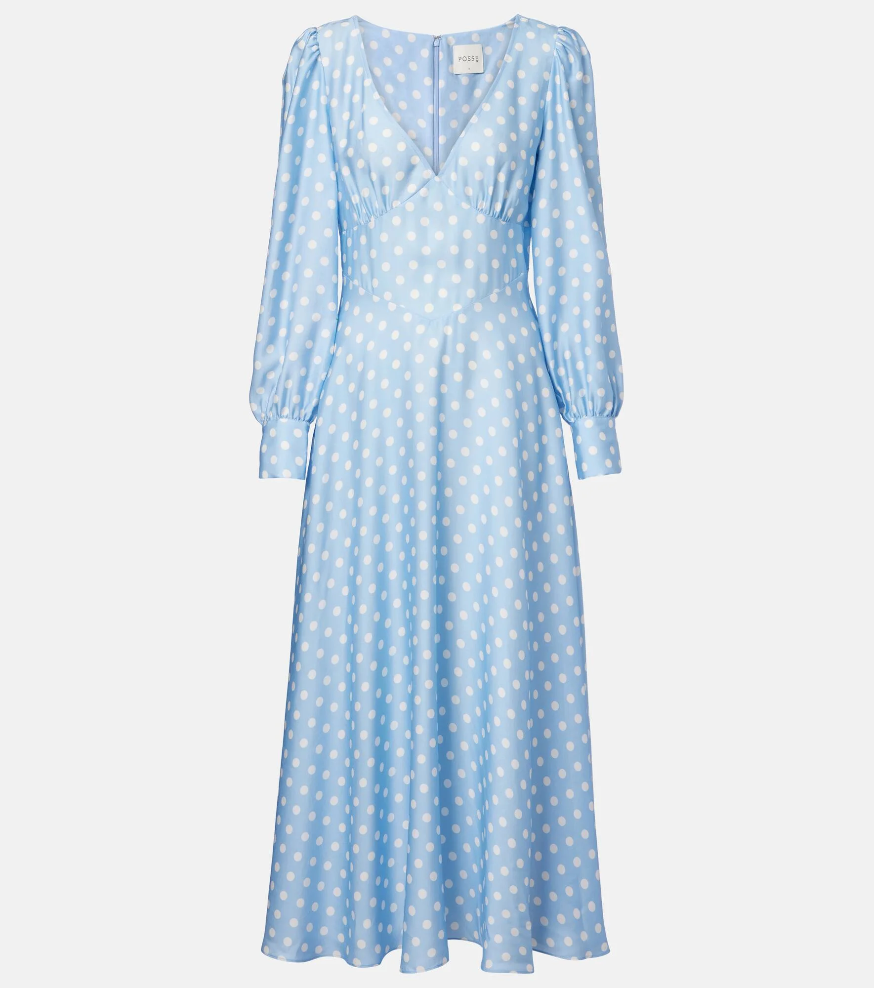Founded in Sydney by Danielle Mulham in 2016, Posse offers effortlessly elegant silhouettes. Crafted from polka-dot satin, the Tilly midi dress features long billowing sleeves and a flattering plunging neckline. Product Details - Material: 63% Tencel®, 37% viscose - Care instructions: dry clean - Made in China - Color: blue - Designer color name: Blue Polka Dot - Item color: blue, white - Collar: V-neck - Cuff: buttoned - Closure: invisible zipper - Item number: P01124614 Size & Fit - True to size - Cinched waist - Non-stretchy fabric - The model seen in the picture is 178cm-5'10" and wearing a size XS