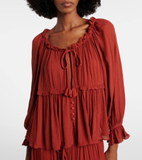 Embrace elegance with this design from Poupette St Barth. The Moon top features a flowing silhouette with buttoned front closure and a self-tie at the neck. Product Details - Material: 100% viscose - Care instructions: hand wash - Made in Indonesia - Designer color name: Rust 26 Plain - Item color: red - Cuff: elasticated - Closure: buttoned front - Self-tie neck - Item number: P01125335 Size & Fit - True to size - Designed for a loose fit - Non-stretchy fabric - Falls to the hip - The model seen in the picture is 178cm-5'10" and wearing a size XS