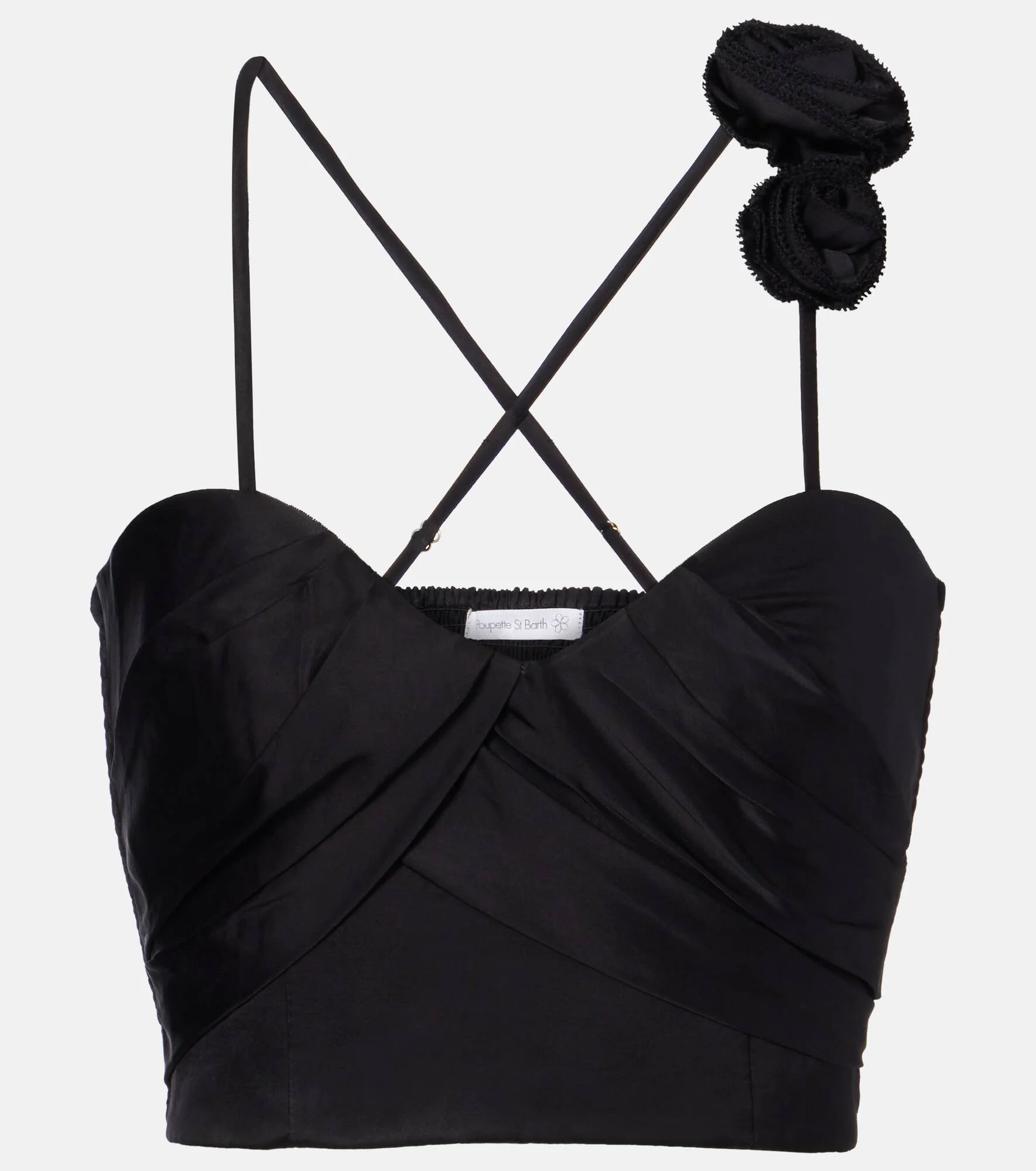 Center your vacation wardrobe around Poupette St Barth's beautifully breezy styles. The Palmira crop top features adjustable shoulder straps that cross at the front, adorned with charming floral appliques. Product Details - Material: 100% viscose - Care instructions: hand wash - Made in Indonesia - Designer color name: Black Plain - Item color: black - Adjustable shoulder straps - Item number: P01126465 Size & Fit - True to size - Elasticated top - Fitted - Non-stretchy fabric - Cropped - The model seen in the picture is 178cm-5'10" and wearing a size XS