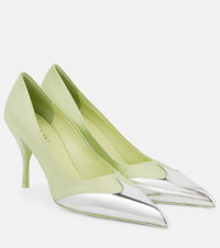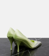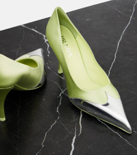 Prada takes Italian heritage into a distinctly modern direction with a streamlined and fashion-forward approach. Crafted in Italy, these satin pumps feature metallic leather toecaps along with leather insoles and soles on pointed-toe silhouettes. Product Details - Upper: fabric - Lining: leather - Sole: leather insole and sole - Toe shape: pointed toe - Made in Italy - Includes: shoe box - Designer color name: Rugiada - Item color: green - Trim: leather - Hardware color: silver - Item number: P01039778 Size & Fit - Fits slightly large to size - we recommend trying a half size smaller - Narrow at the toe - European sizes - 9cm-3.5" heel (size EU 38)