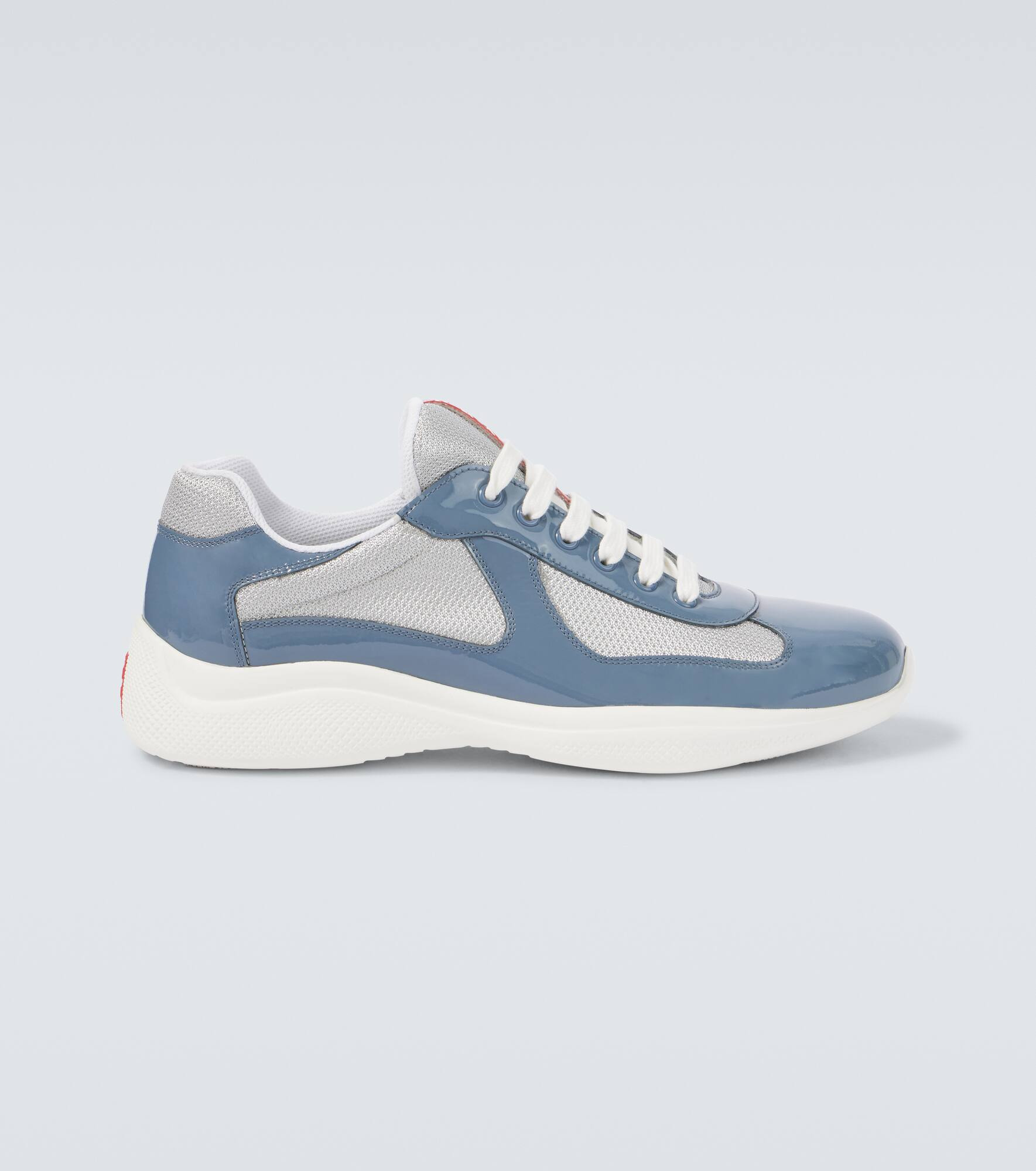 Prada takes Italian heritage into a modern direction with a streamlined and fashion-forward approach. The America's Cup sneakers are crafted from premium patent leather with fabric inserts and boast the unmistakable Prada Linea Rossa label on the tongues. Product Details - Upper: calf leather, fabric - Lining: fabric - Sole: fabric insole, rubber sole - Toe shape: round toe - Made in Italy - Includes: shoe box - Designer color name: Light Blue - Item color: blue - Closure: lace-up - Item number: P01083930 Size & Fit - True to size - Half sizes please take the next size up - UK sizes