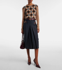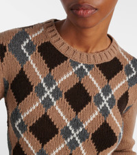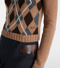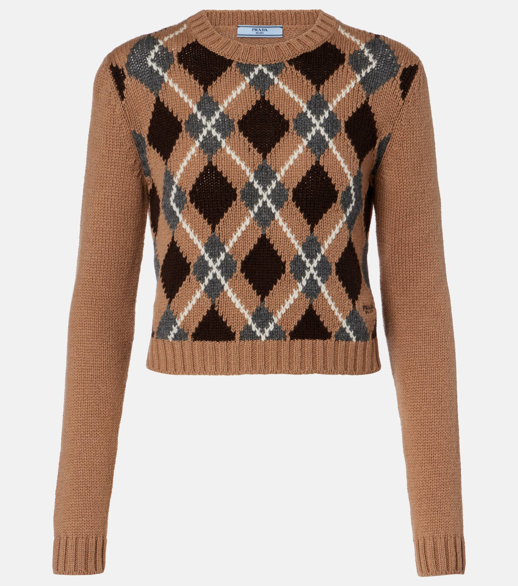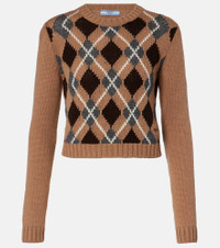 Made in Italy from cashmere jacquard, this Prada crewneck sweater features an elegant argyle motif. Cut to a slightly cropped silhouette, the design is finished with ribbed-knit cuffs and hem. Product Details - Material: 100% cashmere - Care instructions: dry clean - Made in Italy - Designer color name: Cammello - Item color: beige, multicolor - Collar: crewneck - Cuff: ribbed - Hem: ribbed - Item number: P01061911 Size & Fit - True to size - Straight fit - Non-stretchy fabric - Falls to the hip - The model seen in the picture is 178cm-5'10" and wearing a size IT 40