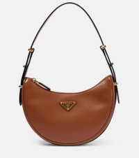 The Arque shoulder bag features Prada's iconic triangular logo plaque, which embodies simplicity, elegance, and quality. Made from nappa leather, it's further enhanced by its curved silhouette and gold-toned hardware. Product Details - Material: leather - Lining: leather - Made in Italy - Designer color name: Cognac - Closure: zipped top - Internal details: internal slot pocket - Adjustable shoulder strap - Includes: dust bag - Hardware color: gold - Item number: P00819434 Size & Fit - Height 13cm-5" - Width 24cm-9.5" - Max. depth 6cm-2.5" - Min. length shoulder strap 46cm-18" - Max. length shoulder strap 58cm-23"