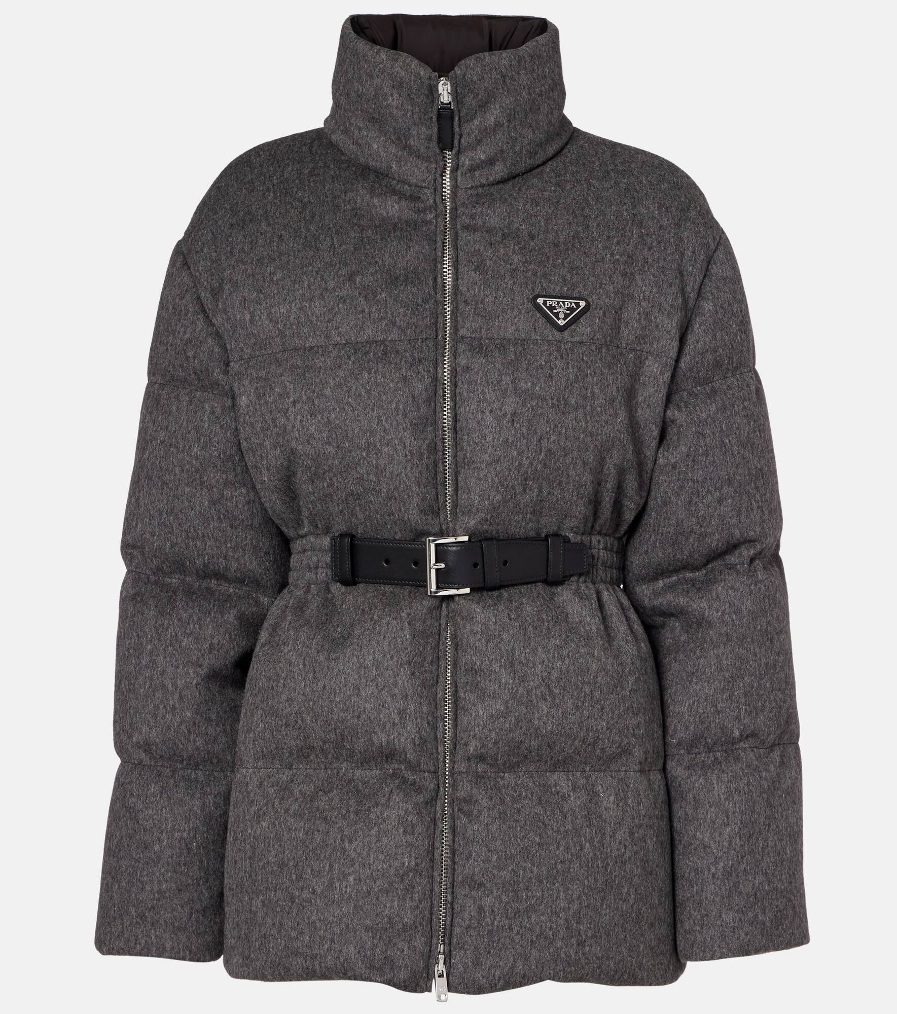 This jacket from Prada is made from virgin wool loden with down padding for a stylish and highly-insulating piece. The design is fitted with the brand-signature logo patch and a belted waist for a cinched finish. Product Details - Material: 100% virgin wool - Care instructions: specialist clean - Made in Italy - Designer color name: Ardesia - Item color: gray - Lining: 100% polyamide (recycled) - Filling: 90% down, 10% feathers - Material II: 100% polyester (recycled) - Details: 100% calf leather - Contains non-textile parts of animal origin - Closure: two-way zipped front, buckle fastening - Pockets: side slit pockets, internal pocket - Attached belt - Elasticated waistband - Item number: P01124906 Size & Fit - True to size - Dropped shoulders - Loose fit, comes with belt - Non-stretchy fabric - Falls below the hip - Height of model is 177cm-69.5" and wears a size IT 40