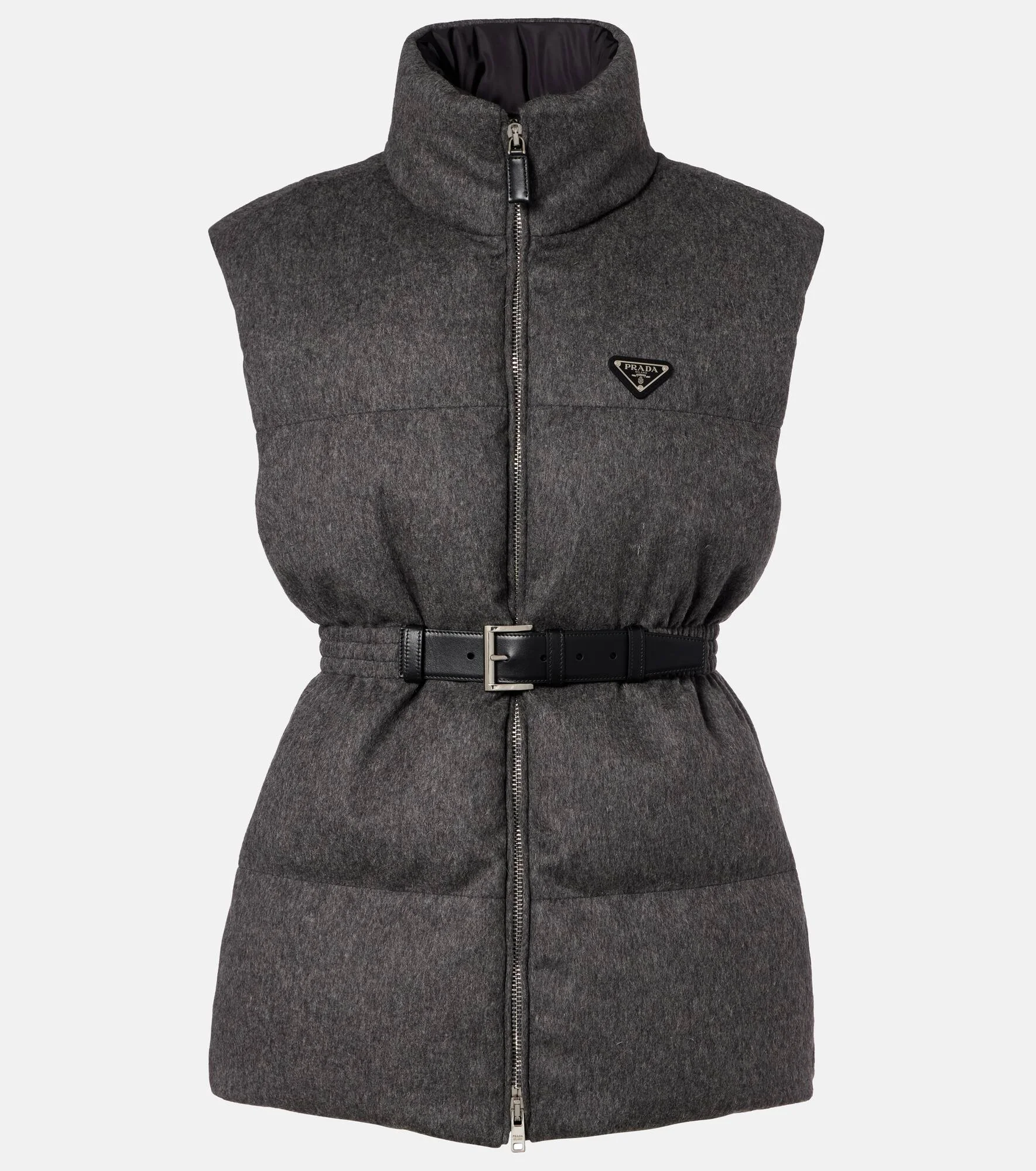 Prada embodies modern sophistication, blending timeless Italian craftsmanship with an innovative spirit. Crafted from virgin wool, this down vest is finished with a cinching belt, a high neck, and the signature triangle logo. Product Details - Material: 100% virgin wool - Care instructions: dry clean - Made in Italy - Designer color name: Grey - Item color: gray - Lining: 100% polyamide - Filling: 90% down, 10% feathers - Contains non-textile parts of animal origin - Insert: 100% calf leather - Filling II: 100% polyester (recycled) - Hardware color: silver - Closure: two-way zipped front - Pockets: side slit pockets - Elasticated waistband - Attached belt - Item number: P01129433 Size & Fit - True to size - Cinched waist - Non-stretchy fabric - Falls below the hip - The model seen in the picture is 178cm-5'10" and wearing a size IT 40