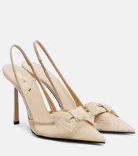 Create sophisticated looks around these slingback pumps from Prada. Crafted from mesh and trimmed with leather, this pair is defined by charming bow detailing on the uppers. Product Details - Upper: synthetic material - Lining: leather - Sole: leather insole, rubber sole - Color: beige - Toe shape: pointed toe - Made in Italy - Includes: shoe box - Designer color name: Neutral - Trim: leather - Slingback strap - Item number: P01152471 Size & Fit - Fits slightly large to size - we recommend trying a half size smaller - European sizes - 10cm-4" heel