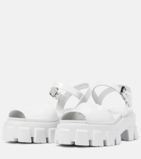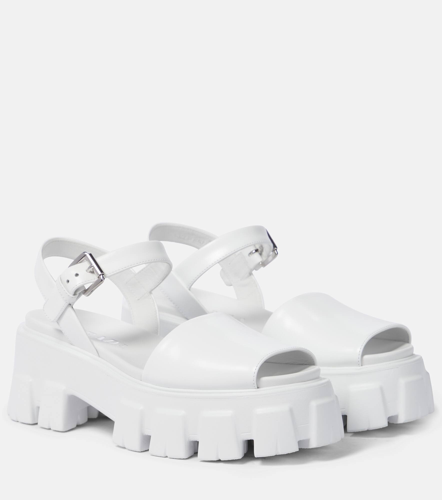 With the lugged, exaggerated rubber soles that have become a Prada hallmark in recent seasons, these sandals will have you storming into summer. This white pair is made from brushed leather for a glossy finish. Product Details - Upper: leather - Lining: leather - Sole: leather insole, rubber sole - Toe shape: round open toe - Made in Italy - Includes: shoe box - Designer color name: Bianco - Closure: buckle fastening - Hardware color: silver - Item number: P00528784 Size & Fit - True to size - European sizes - 6cm-2.5" heel (size EU 38) - 5cm-2" platform (size EU 38)
