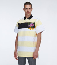 This oversized Prada polo shirt features horizontal stripes in yellow and white, has a contrasting black collar and mother-of-pearl buttons, and is finished with a playful camera print on the left chest. Product Details - Care instructions: machine wash at 30 degrees - Material: 100% cotton - Designer color name: Bianco + Vaniglia - Item number: P00450744 Size & Fit - True to size - Oversized - Stiff material - Falls below the hip - The model in the picture is 185cm-6'1" and wearing a size M