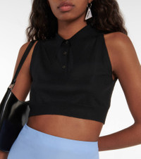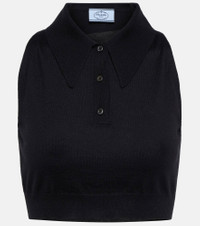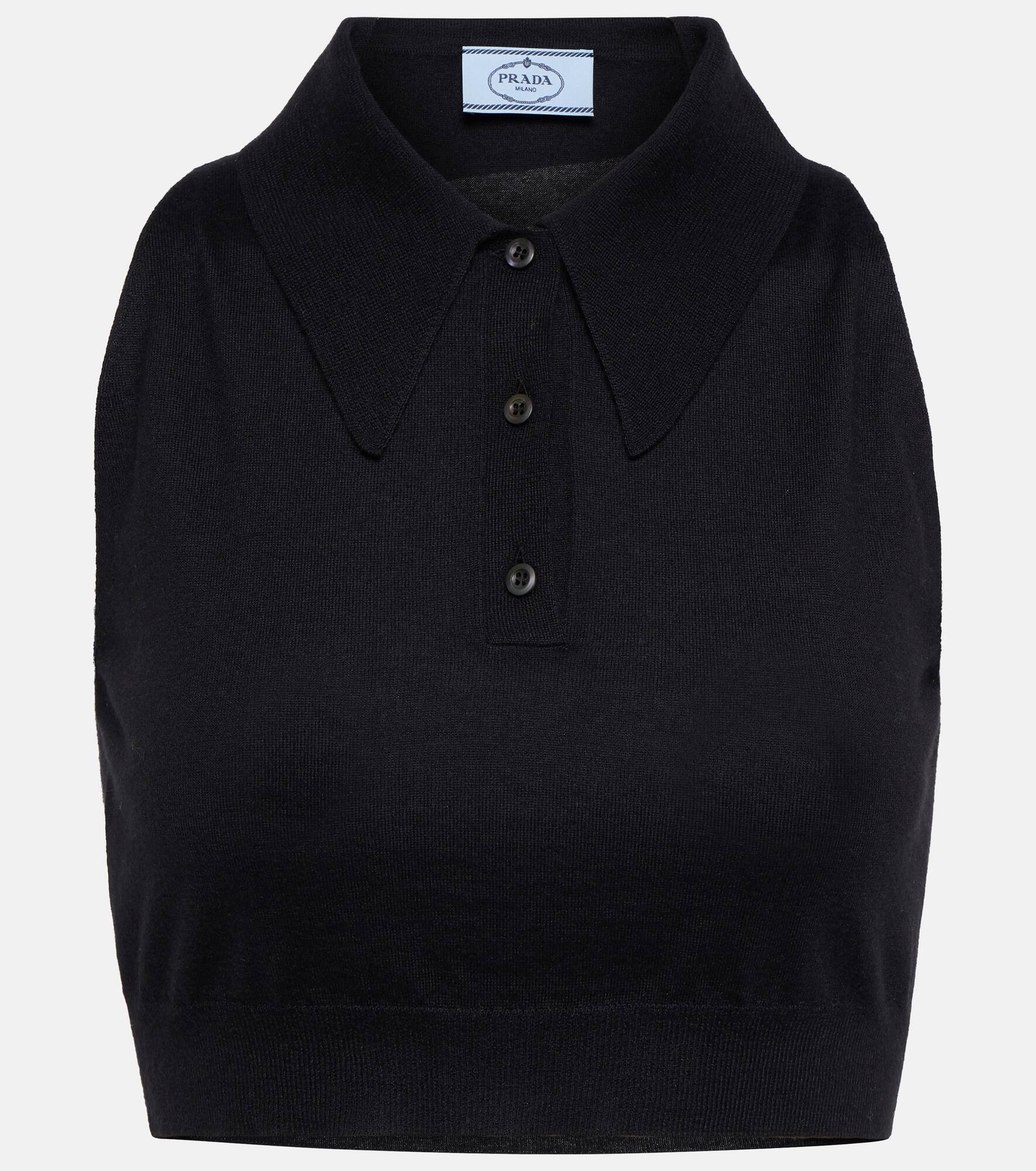 This Prada crop top puts a twist on the classic polo silhouette. It's finely knitted from cashmere and silk and has a handy half-button placket. Product Details - Material: 70% cashmere, 30% silk - Made in Italy - Closure: partially buttoned front - Designer color name: Nero - Care instructions: dry clean - Item number: P00623620 Size & Fit - True to size - Fitted - Cropped - The model seen in the picture is 178cm-5'10" and wearing a size IT 40
