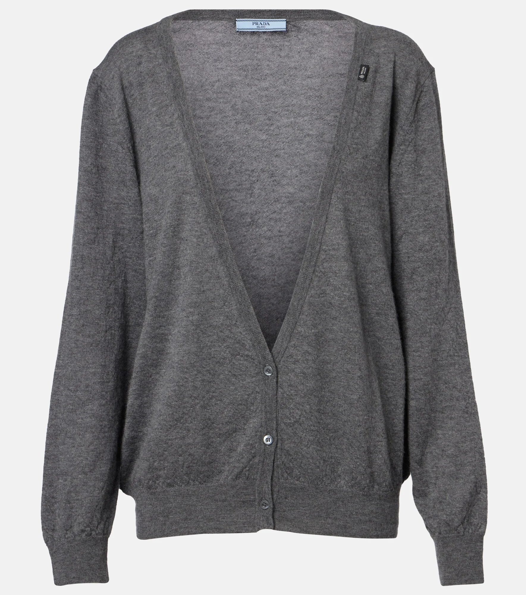 Prada takes Italian heritage into a distinctly modern direction with a streamlined and fashion-forward approach. This cardigan is crafted from cashmere and features a V neckline. Product Details - Material: 100% cashmere - Care instructions: dry clean - Made in Italy - Color: grey - Designer color name: Ardesia - Closure: buttoned front - Hem: ribbed - Cuff: ribbed - Collar: V-neck - Item number: P01172989 Size & Fit - True to size - Dropped shoulders - Designed for a loose fit - Stretchy fabric - Falls to the hip - The model seen in the picture is 178cm-5'10" and wearing a size %size%
