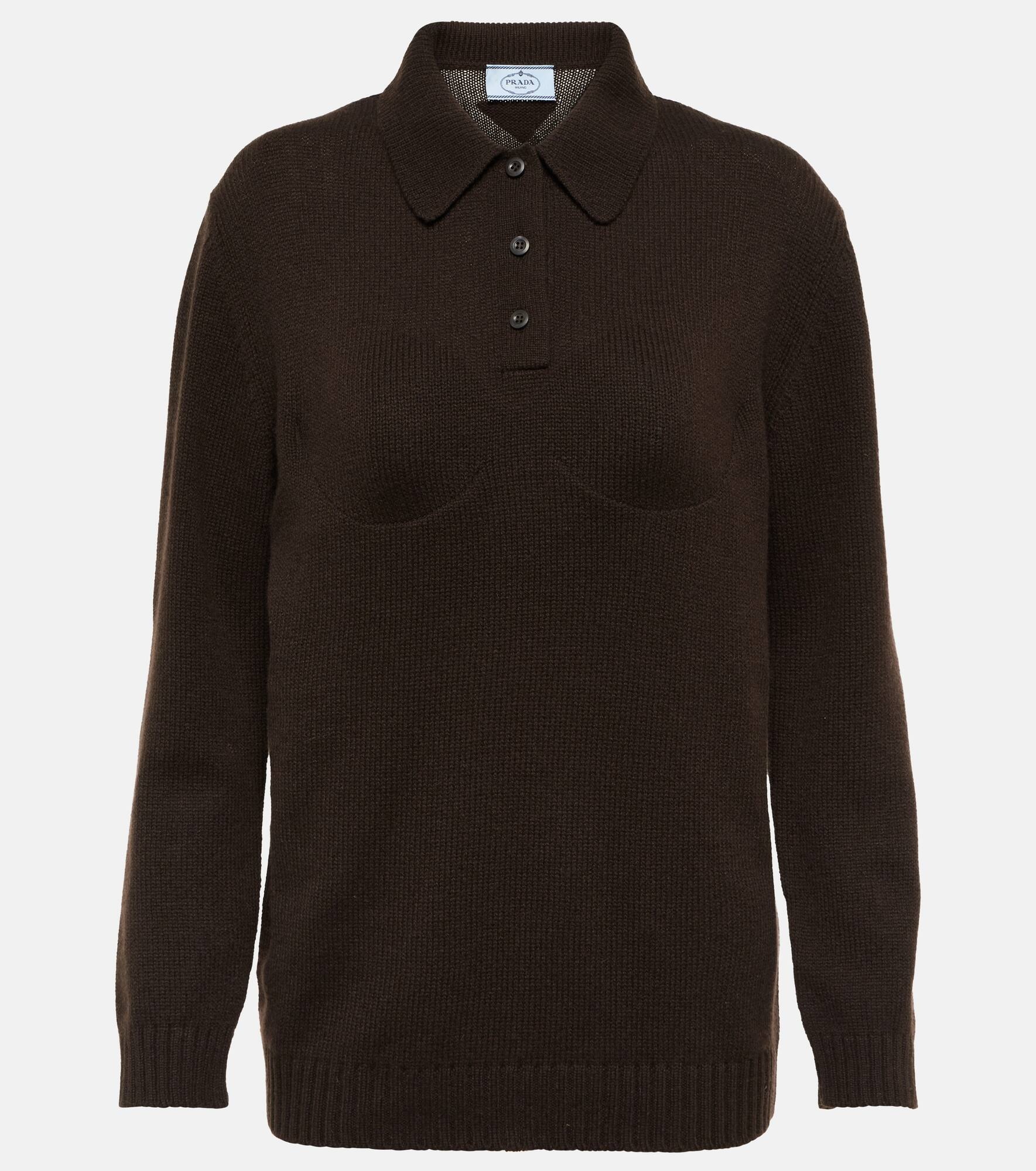 Prada's new-season collection balances masculine and feminine proportions. This polo sweater is made from soft-handled fisherman's ribbed-knit cashmere with underbust contouring inspired by '50s swimsuits. Product Details - Made in Italy - Material: 100% cashmere - Closure: buttoned placket, hook-fastening back - Designer color name: Ebano - Padded cups - Material II: 100% silk - Care instructions: dry clean - Item number: P00655864 Size & Fit - True to size - Dropped shoulders - Internal bra with wire support at the sides - Designed for a loose fit - Falls below the hip - The model seen in the picture is 178cm-5'10" and wearing a size XS