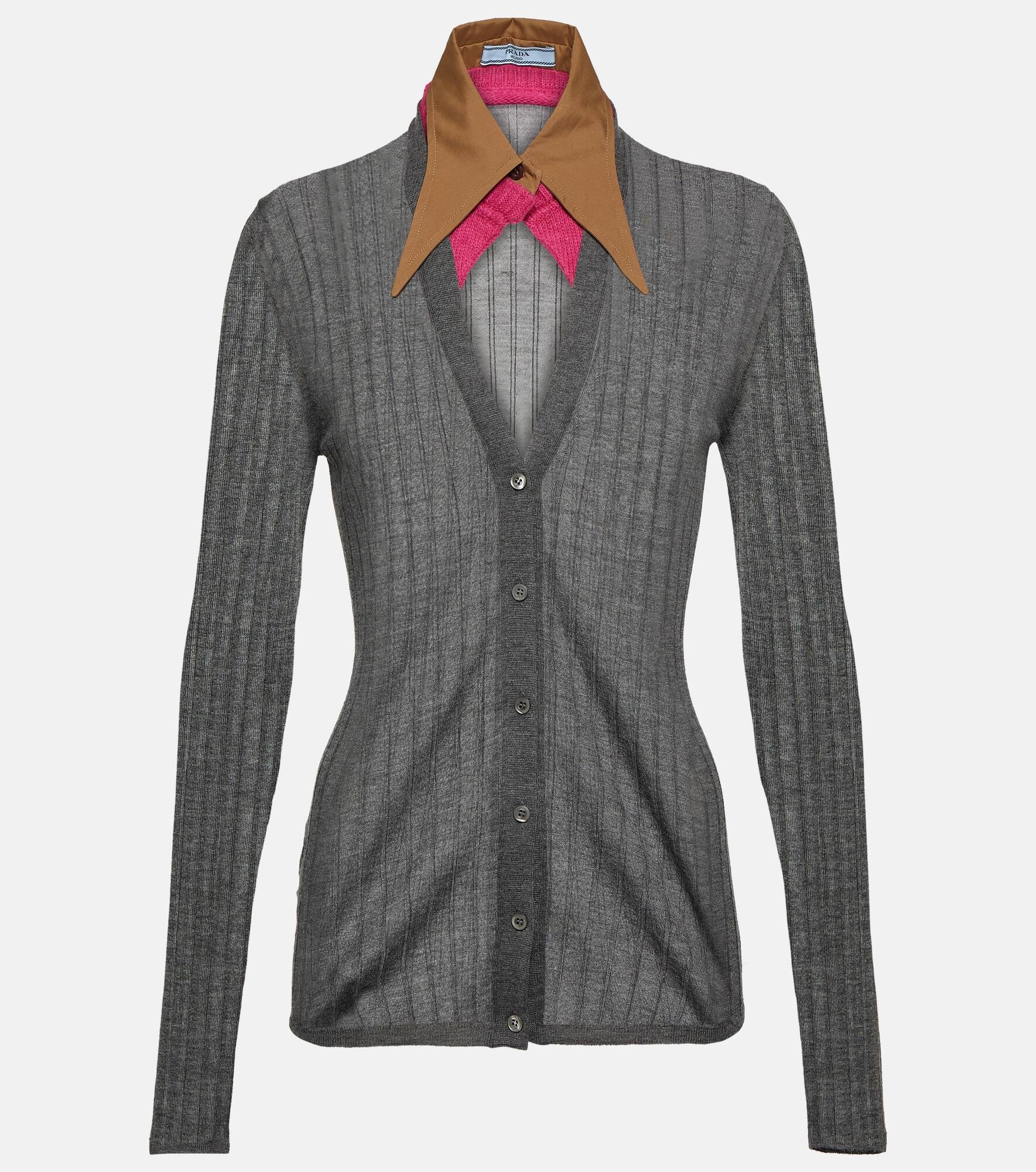 Prada takes Italian heritage into a distinctly modern direction with a streamlined and fashion-forward approach. This cardigan is rib-knitted from an ultra-lightweight cashmere, wool, and silk blend to a fitted silhouette with a V-neckline. Product Details - Material: 54% cashmere, 28% wool, 18% silk - Care instructions: dry clean - Made in Italy - Designer color name: Ardesia - Material II: 100% cotton - Closure: buttoned front - Contains non-textile parts of animal origin - Item number: P00850653 Size & Fit - True to size - Cinched waist - Falls to the hip - The model seen in the picture is 178cm-5'10" and wearing a size IT 40